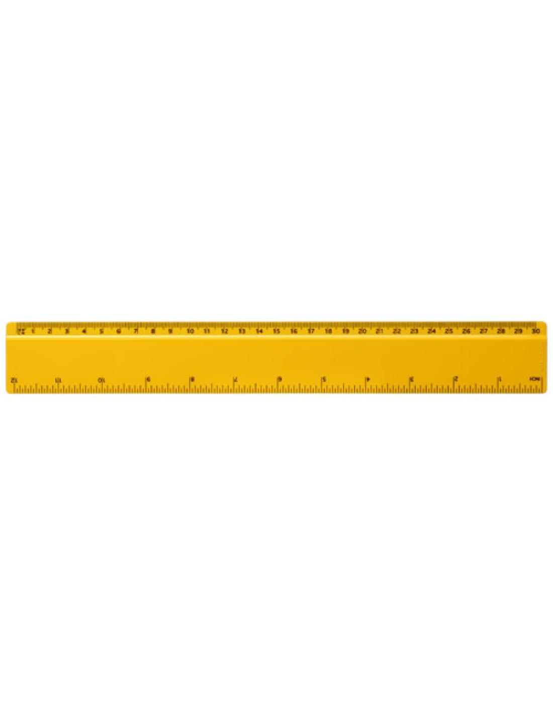 Regla de plástico rígida con marcas tanto en pulgadas como en centímetros. Tenga en cuenta que las marcas de la regla se imprimen junto con los logos, las reglas estándar de stock no llevarán marcas.