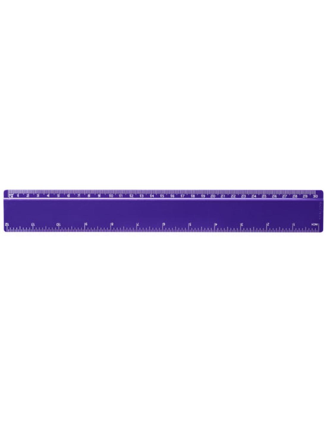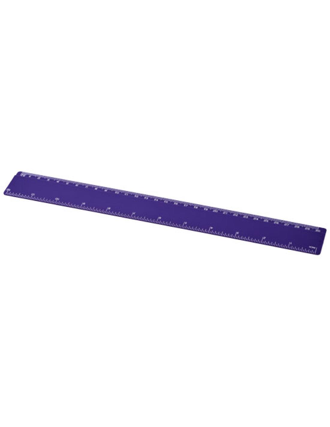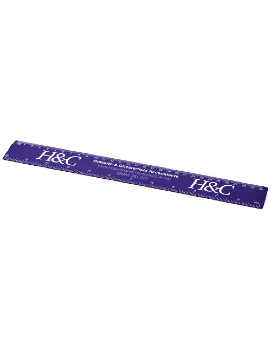 Regla de plástico rígida con marcas tanto en pulgadas como en centímetros. Tenga en cuenta que las marcas de la regla se imprimen junto con los logos, las reglas estándar de stock no llevarán marcas.