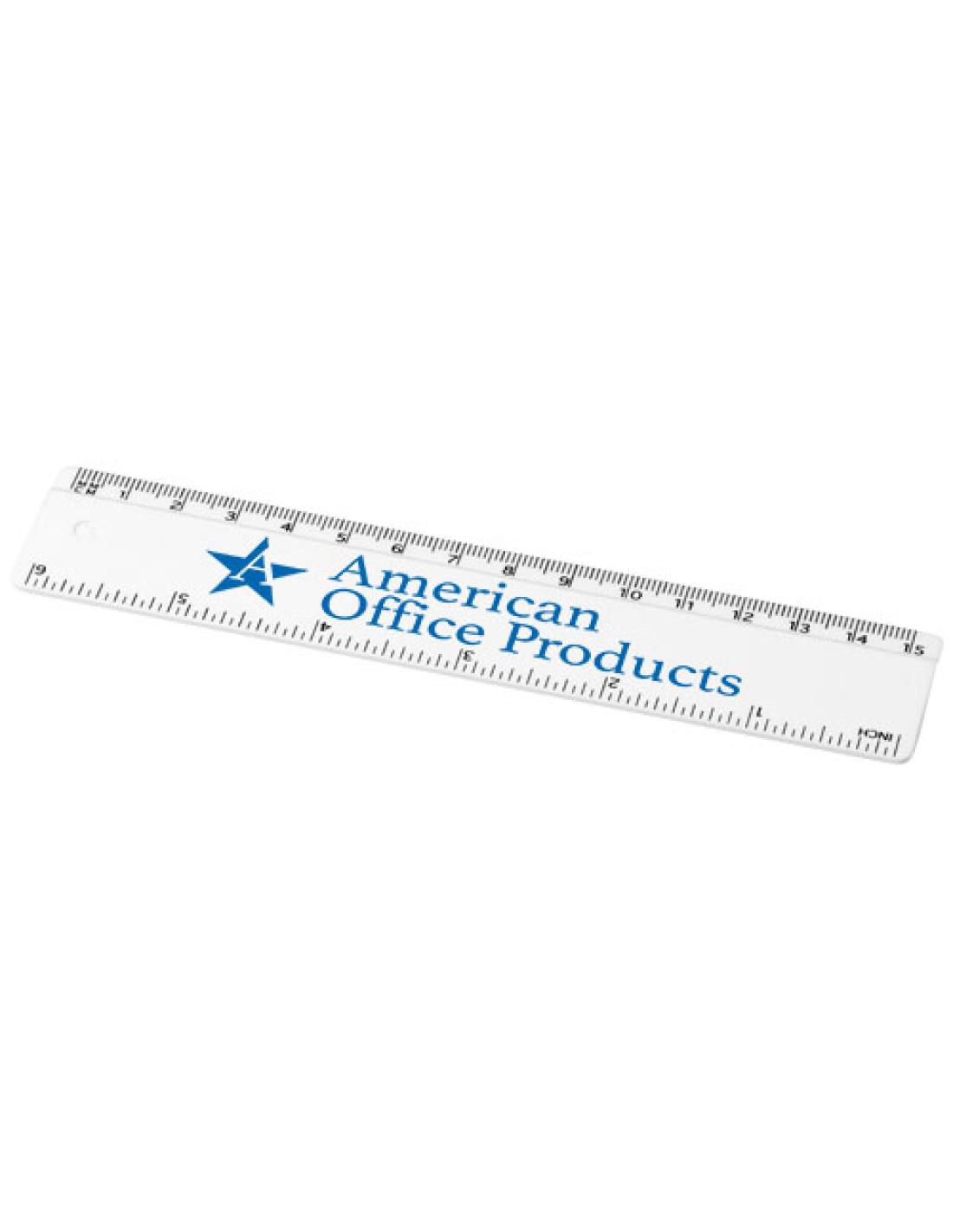 Regla de plástico rígida con marcas en pulgadas y centímetros (sólo cuando sea grabada). Tenga en cuenta que las marcas de la regla se imprimen junto con los logos, las reglas estándar de stock no llevarán marcas.