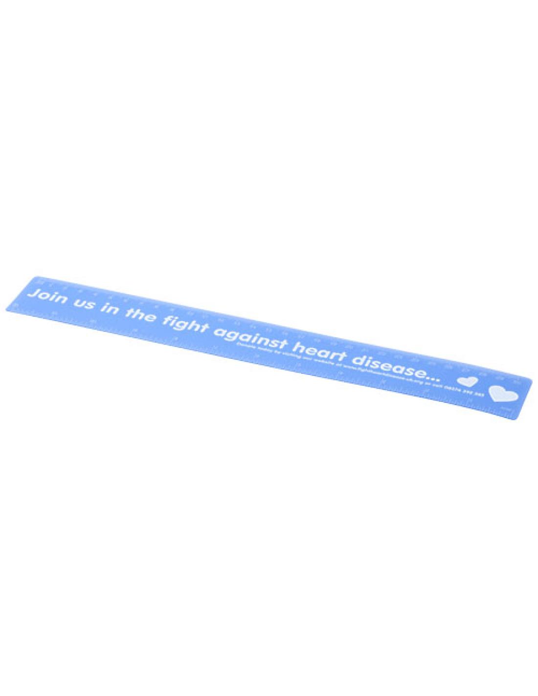 Regla flexible de plástico ligero con marcas tanto en pulgadas como en centímetros. Tenga en cuenta que las marcas de la regla se imprimen junto con los logos, las reglas estándar de stock no llevarán marcas.