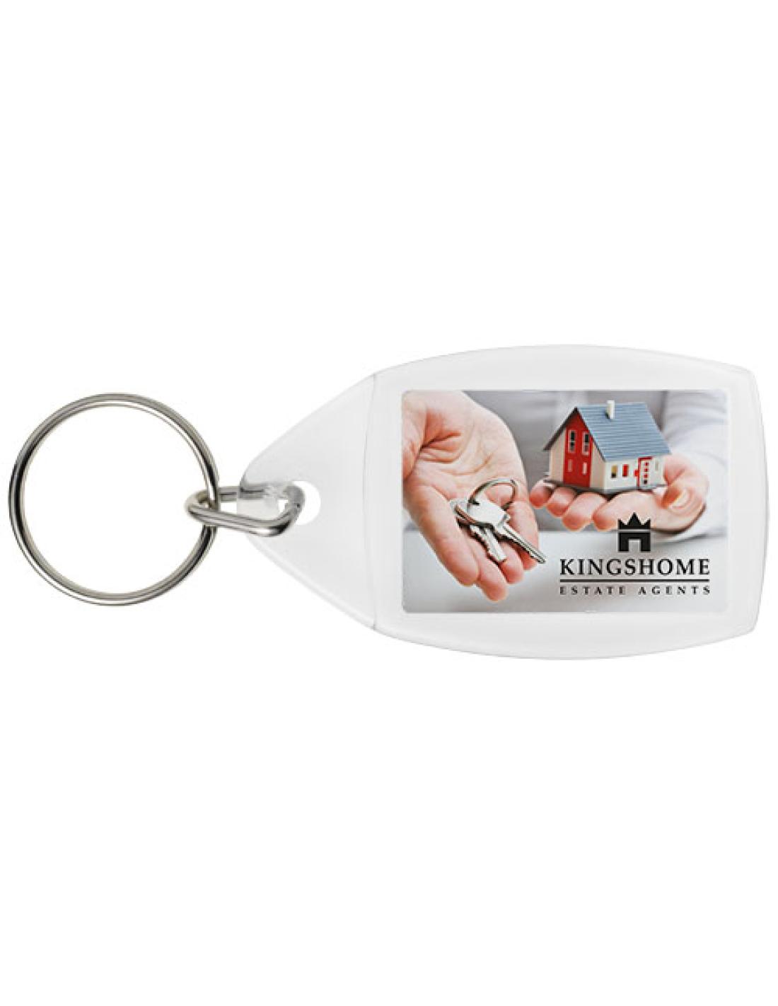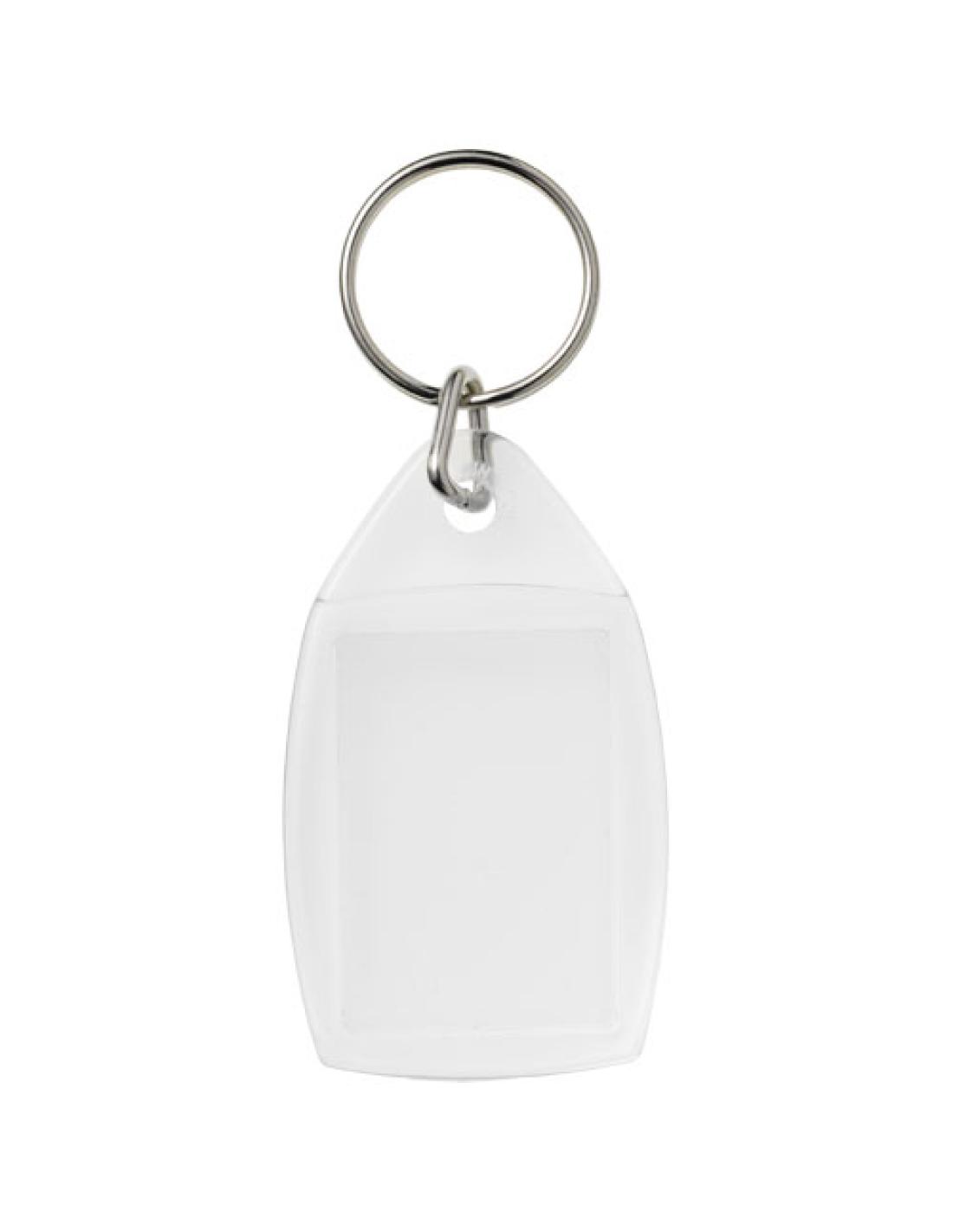 Llavero transparente P5 con anilla abierta de metal. Dimensiones del encarte impreso: 3,5 x 2,4 cm.