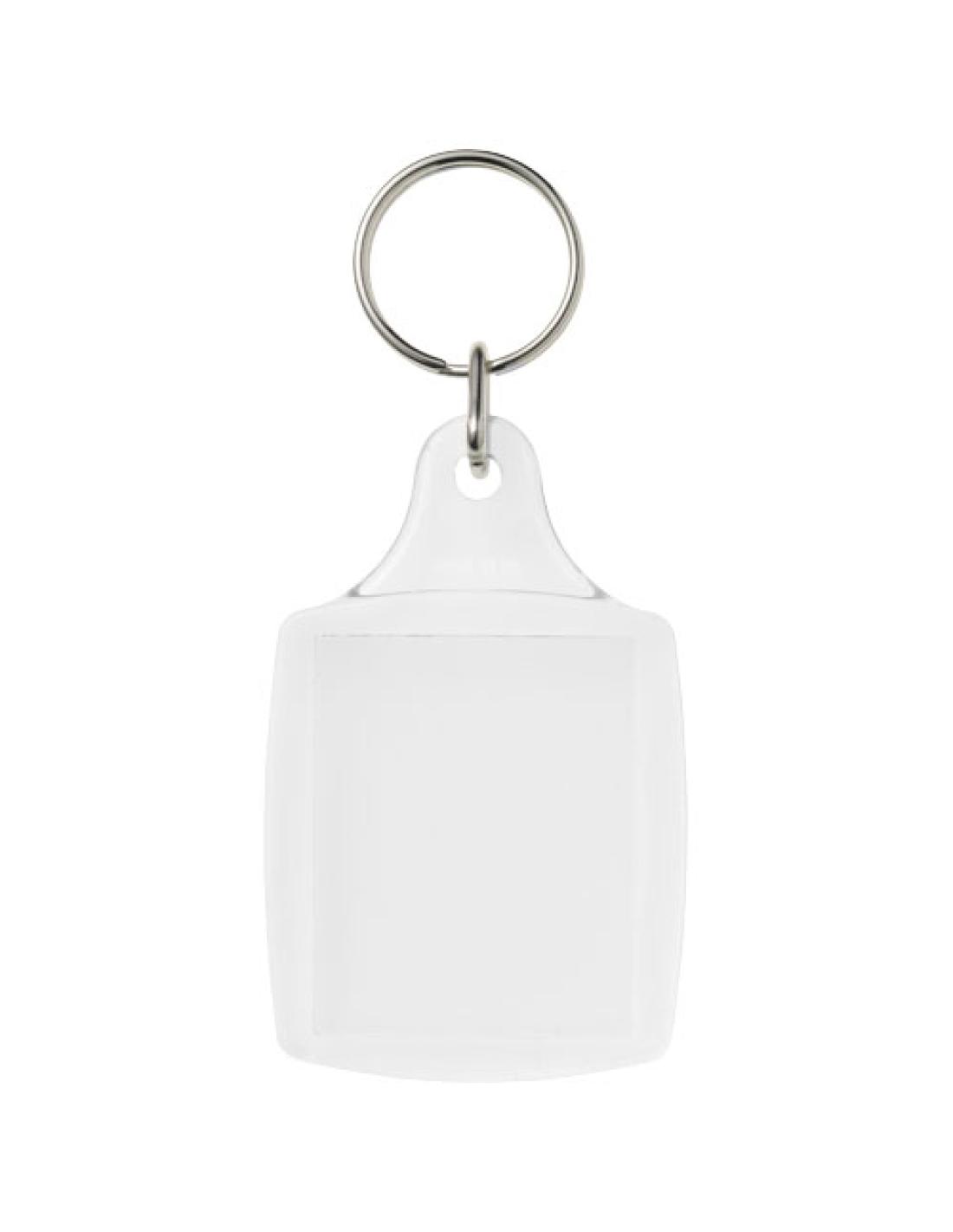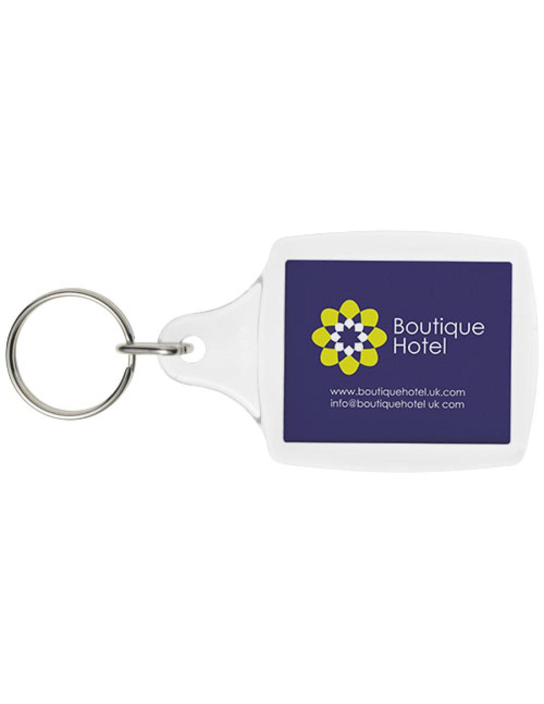 Llavero transparente A5 con anilla abierta de metal. Diseñado para incluir un encarte de papel o una foto de pasaporte extraíbles. Dimensiones del encarte impreso: 4,5 x 3,5 cm.