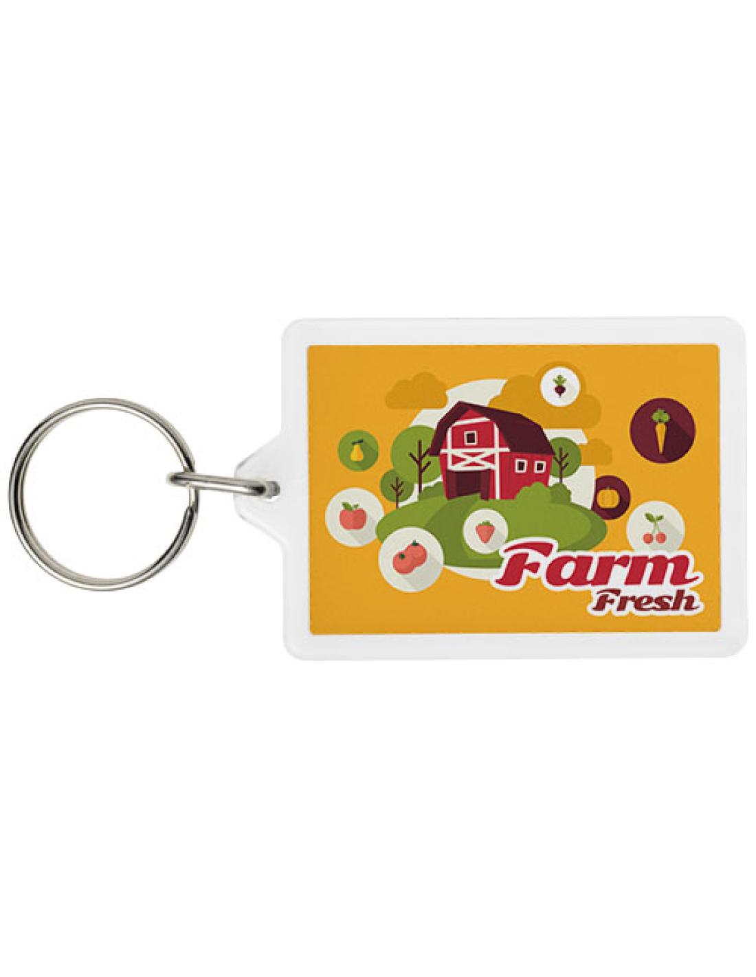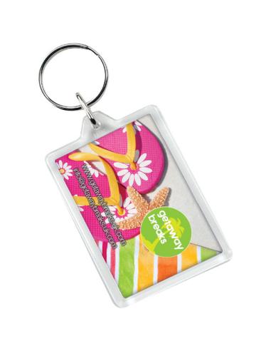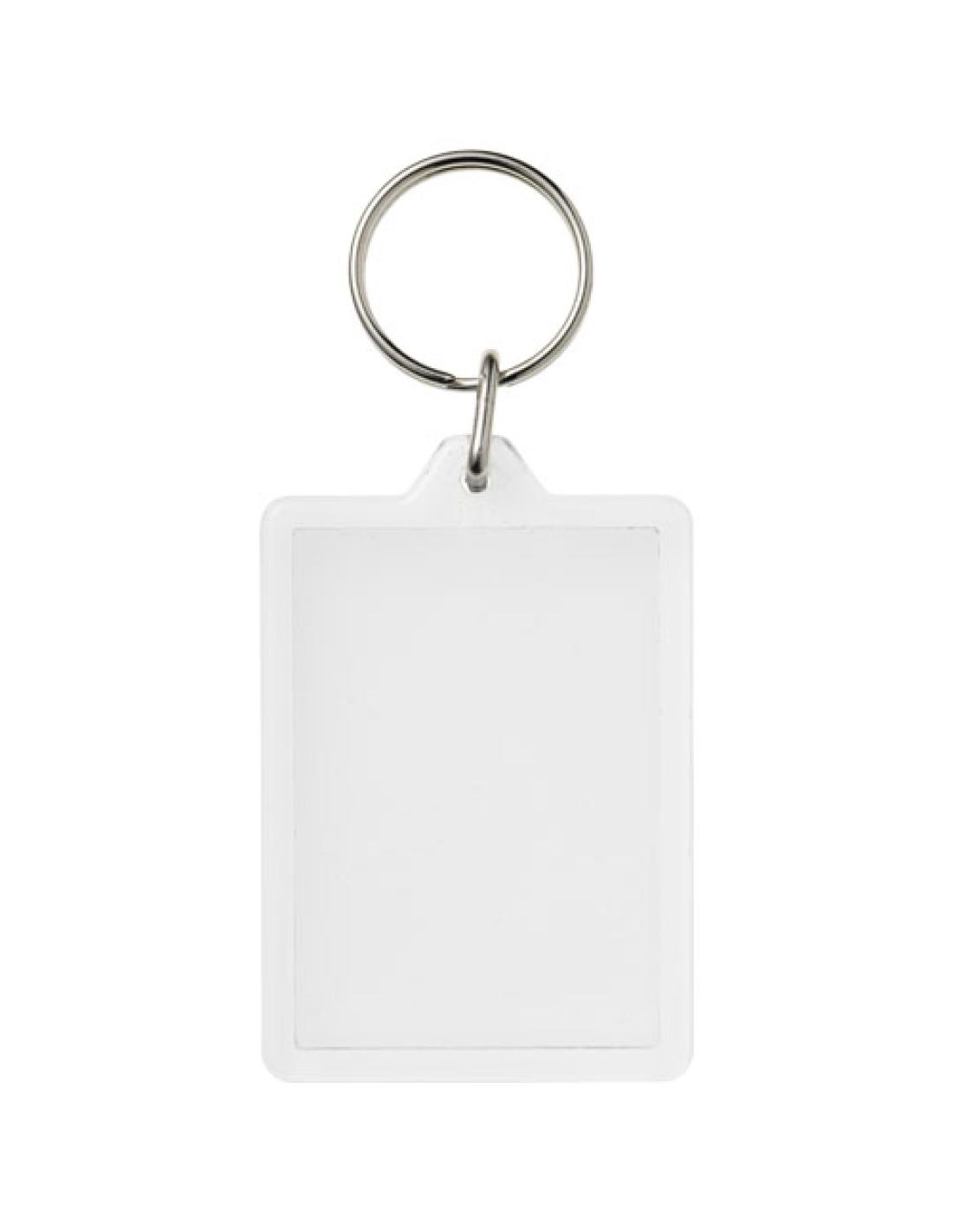 Llavero rectangular transparente C1 con anilla abierta de metal. La anilla de metal es de perfil plano, ideal para envíos por correo postal. Dimensiones del encarte impreso: 5 x 3,5 cm.