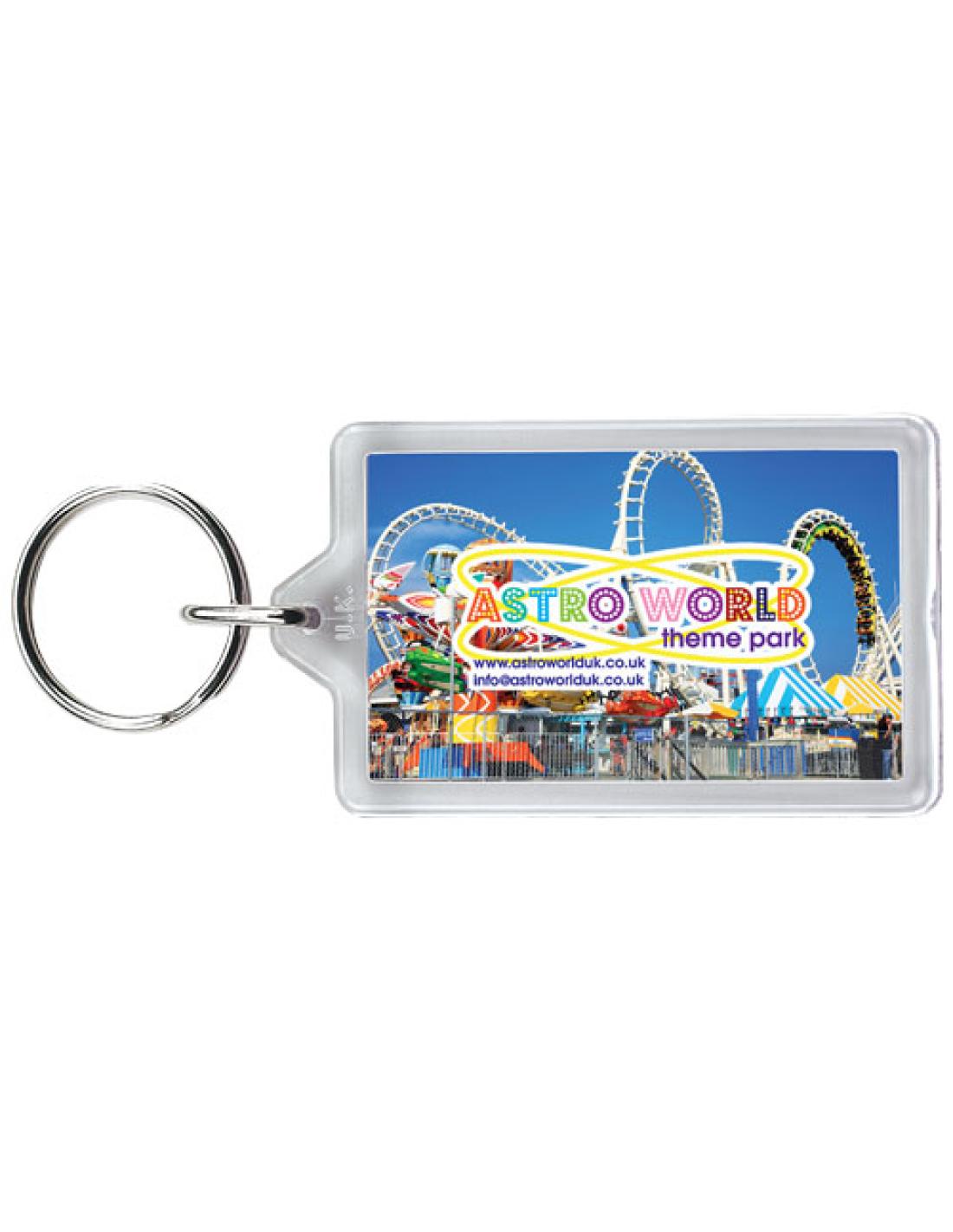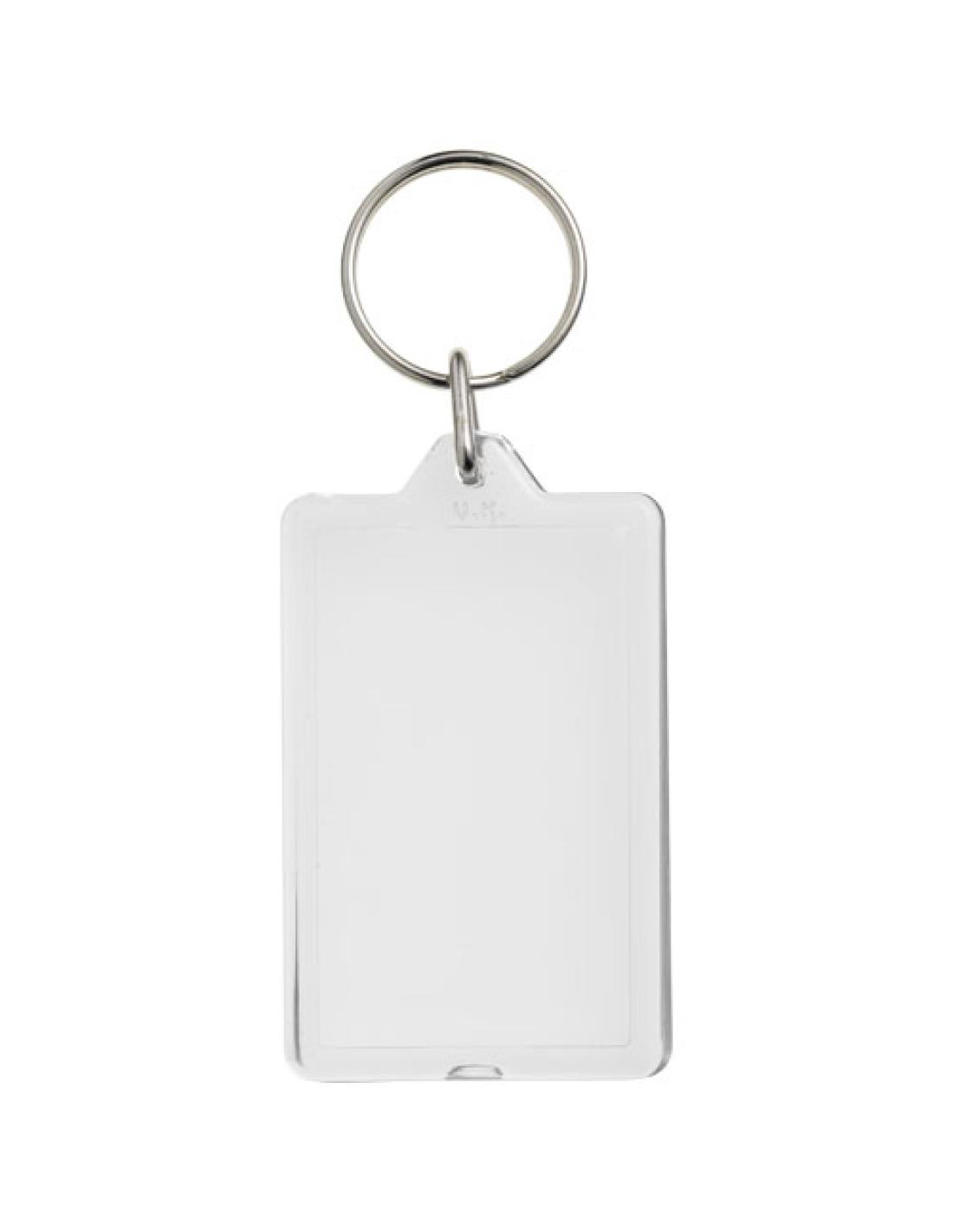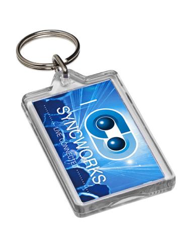 Llavero rectangular transparente G1 con anilla abierta de metal. Este llavero puede abrirse de nuevo con una moneda. La anilla de metal es de perfil plano, ideal para envíos por correo postal. Dimensiones del encarte impreso: 5 x 3,0 cm.