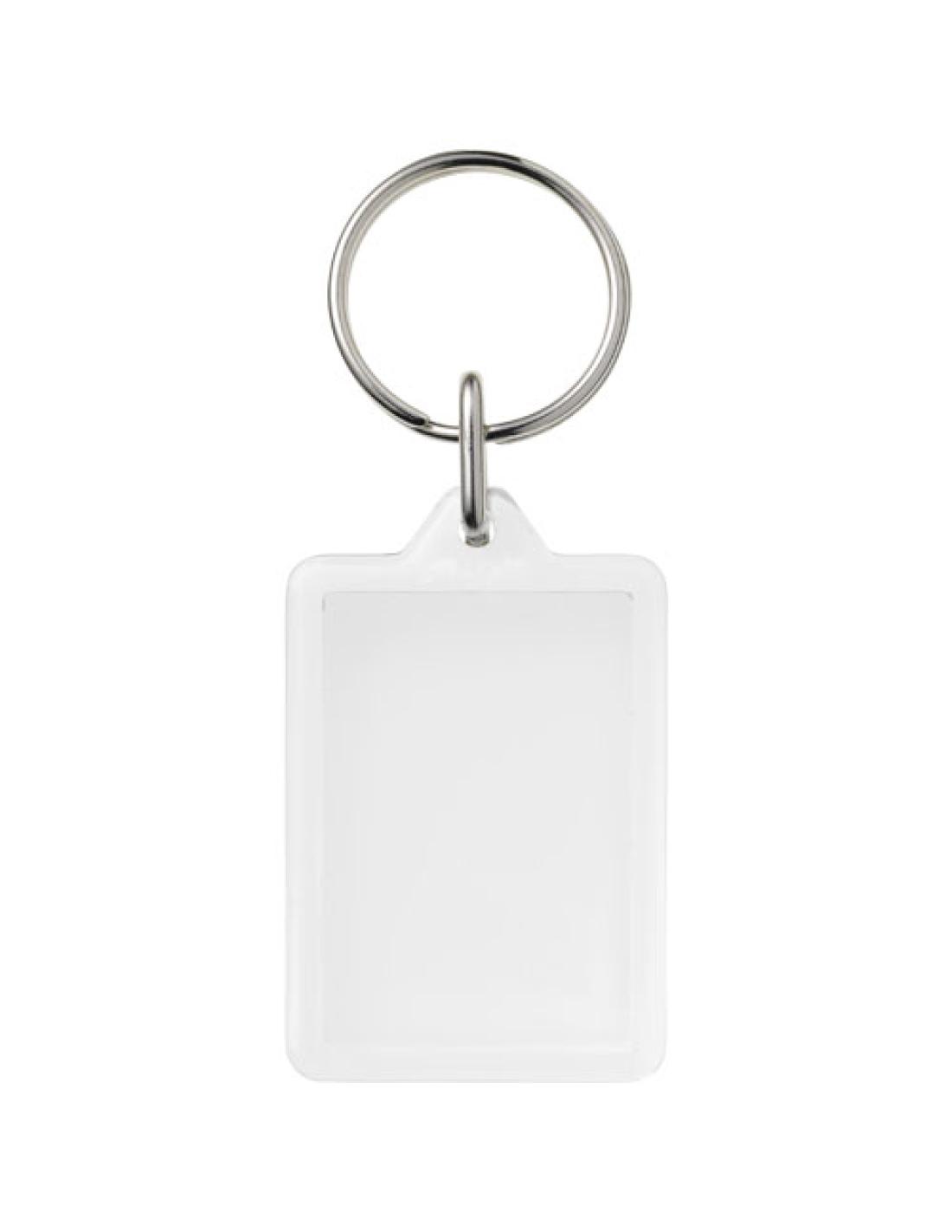 Llavero rectangular transparente Y1 con anilla abierta de metal. La anilla de metal es de perfil plano, ideal para envíos por correo postal. Dimensiones del encarte impreso: 3,5 x 2,4 cm.