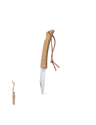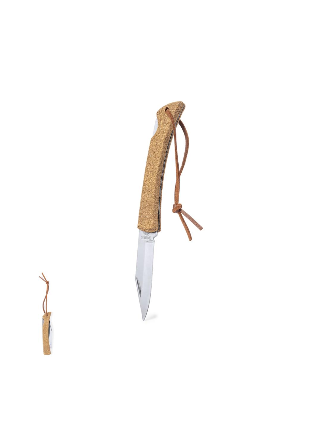 Navaja de línea nature con hoja en acero inox y mango fabricado en corcho natural. Con bloqueo y muesca en la hoja para fácil apertura. Cordón a juego en polipiel y presentada en caja individual de diseño kraft.