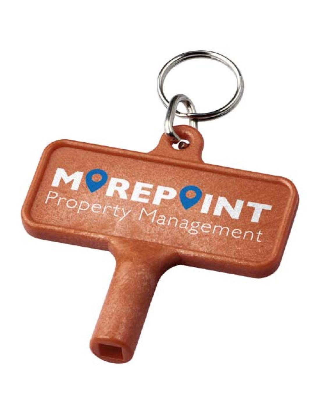 Herramienta de llave con llavero para elementos como radiadores, contadores o postes de luz de la calle. La abertura tiene forma cuadrada con bordes de 5 mm.
