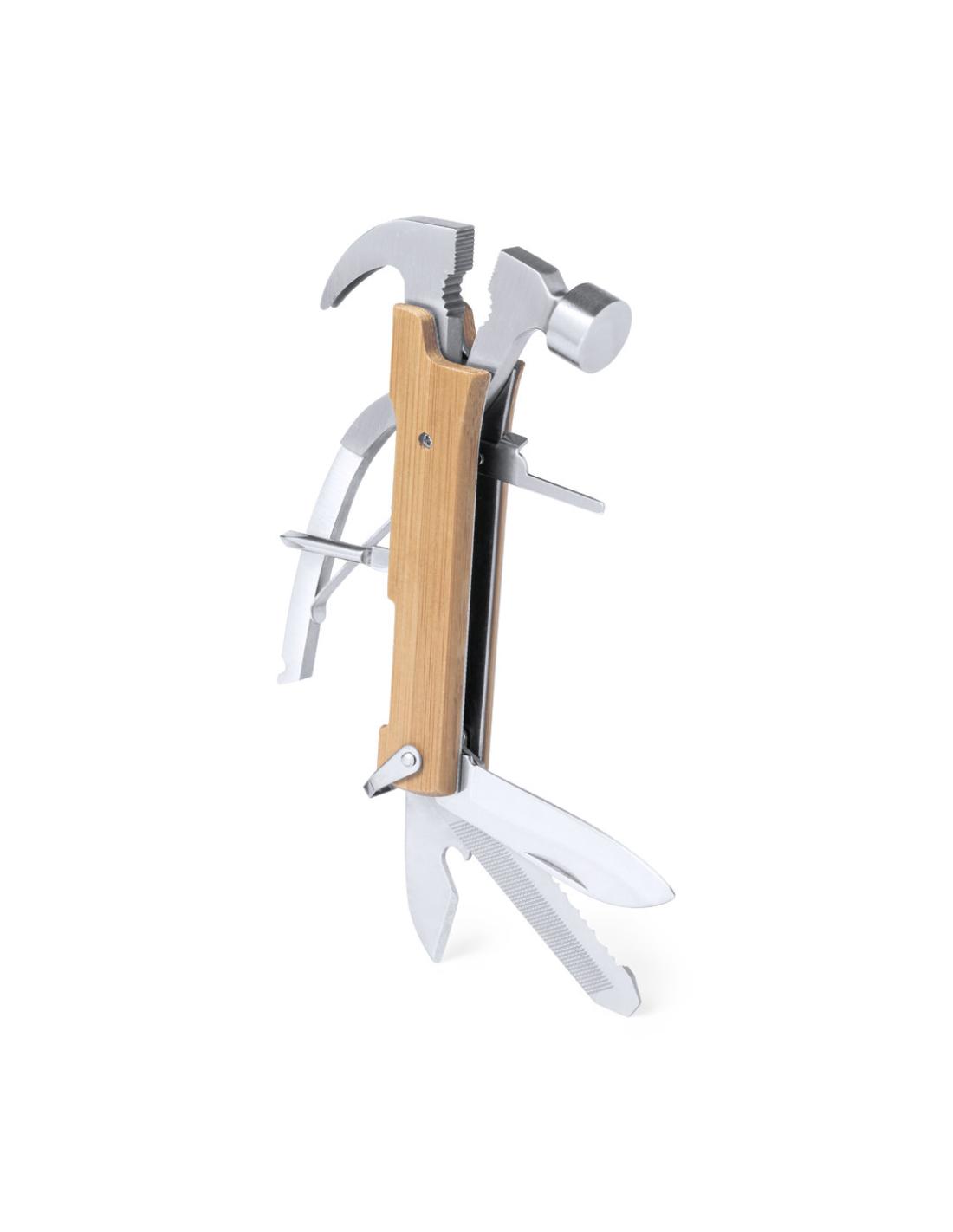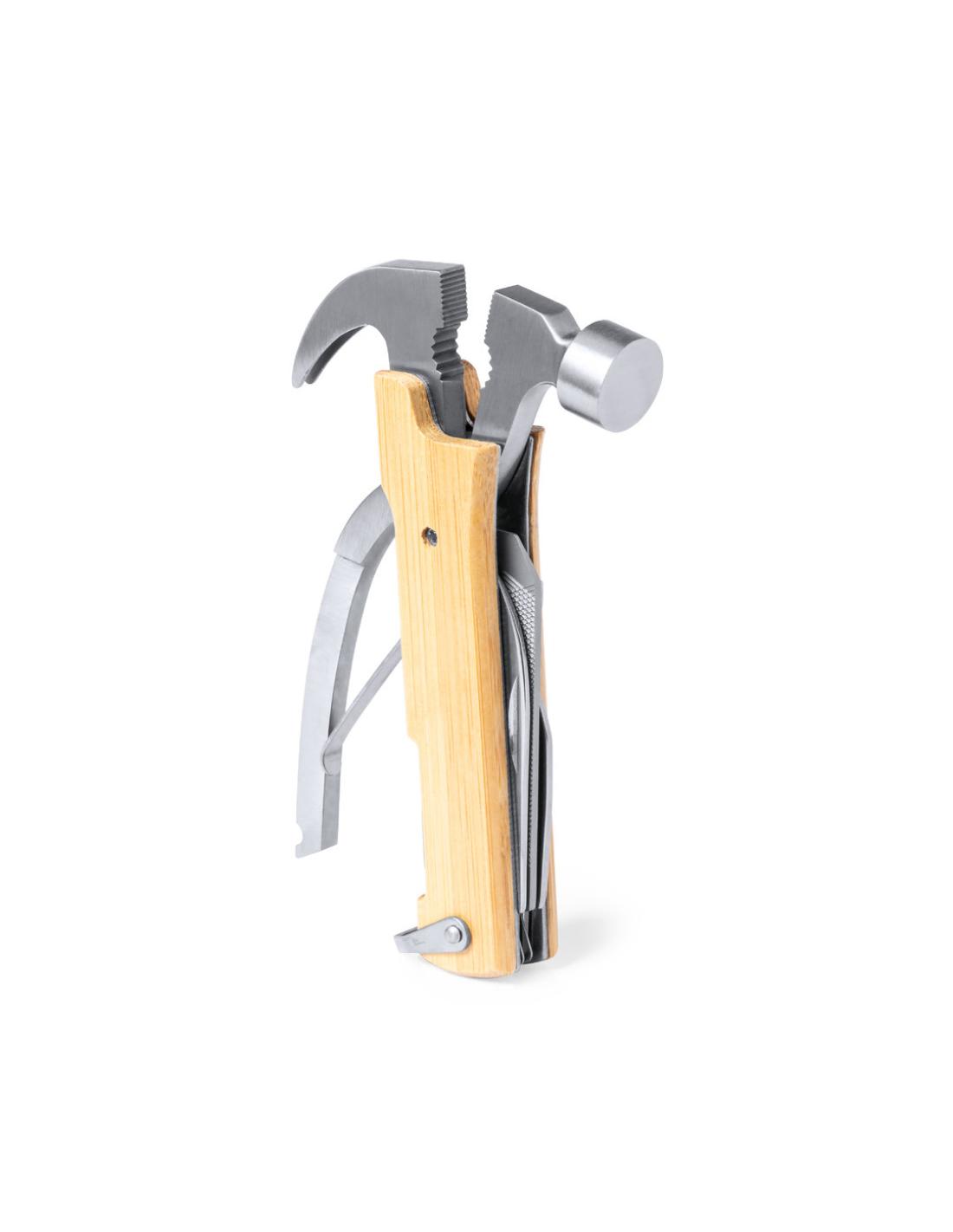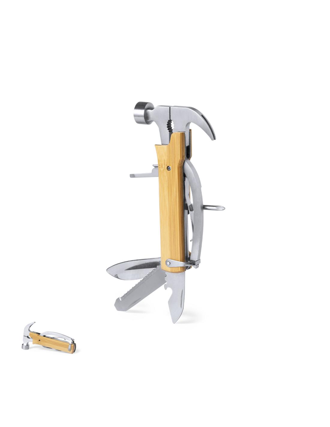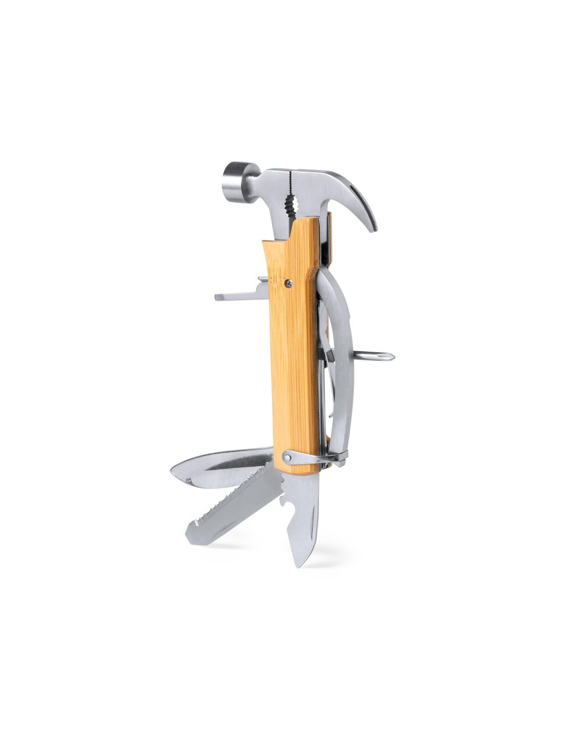 Multiherramienta de línea nature, con resistente cuerpo en acero inox y empuñadura de bambú. Con 13 funciones, entre otras martillo y sacaclavos cuchillo y cortauñas destornillador plano y philips lima abridor y alicates. Cordón a juego en polipiel y presentada en caja individual de diseño kraft.