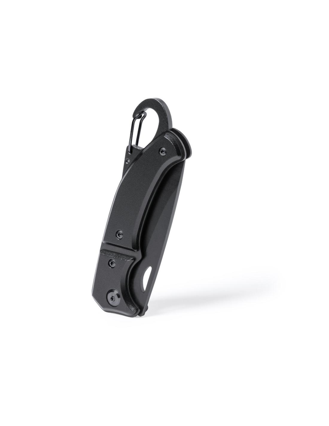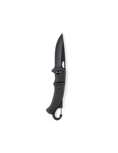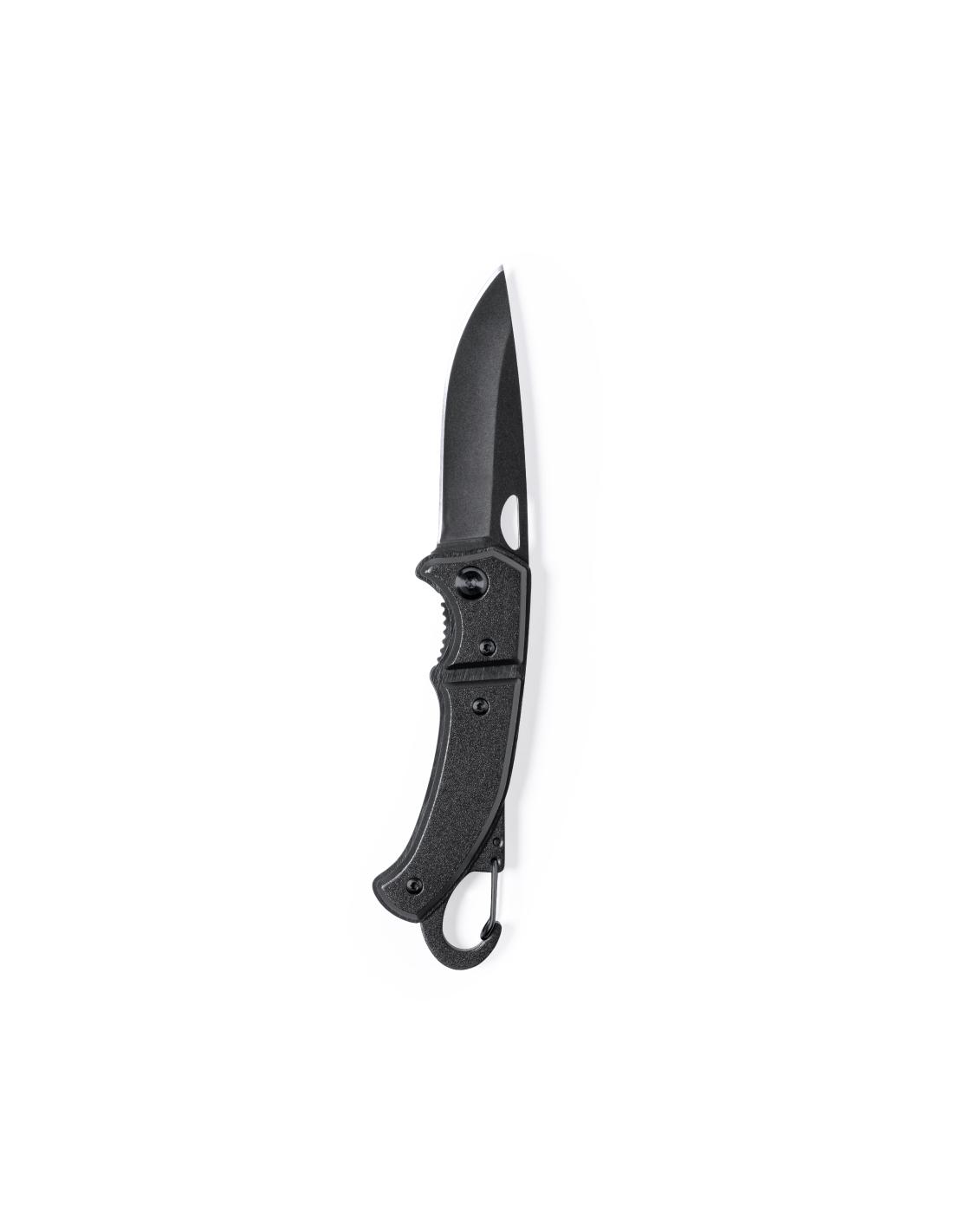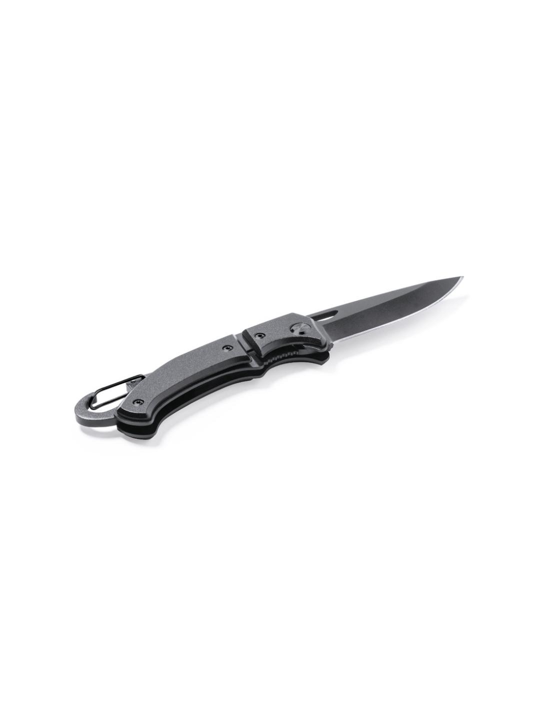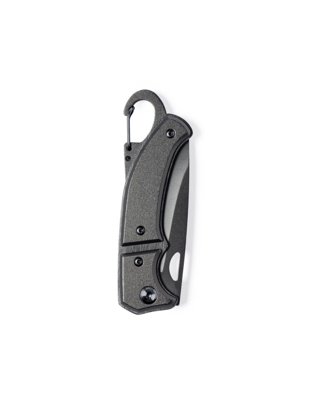 Navaja con hoja en acero inox de acabado negro y resistente empuñadura a juego en aluminio. Con mosquetón integrado en mango y bloqueo de seguridad. Con troquelado en hoja para una fácil apertura y presentada en caja individual de diseño negra.