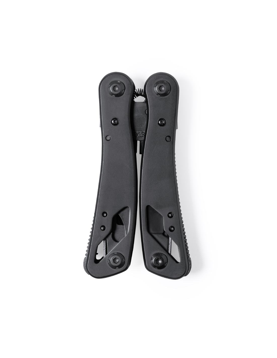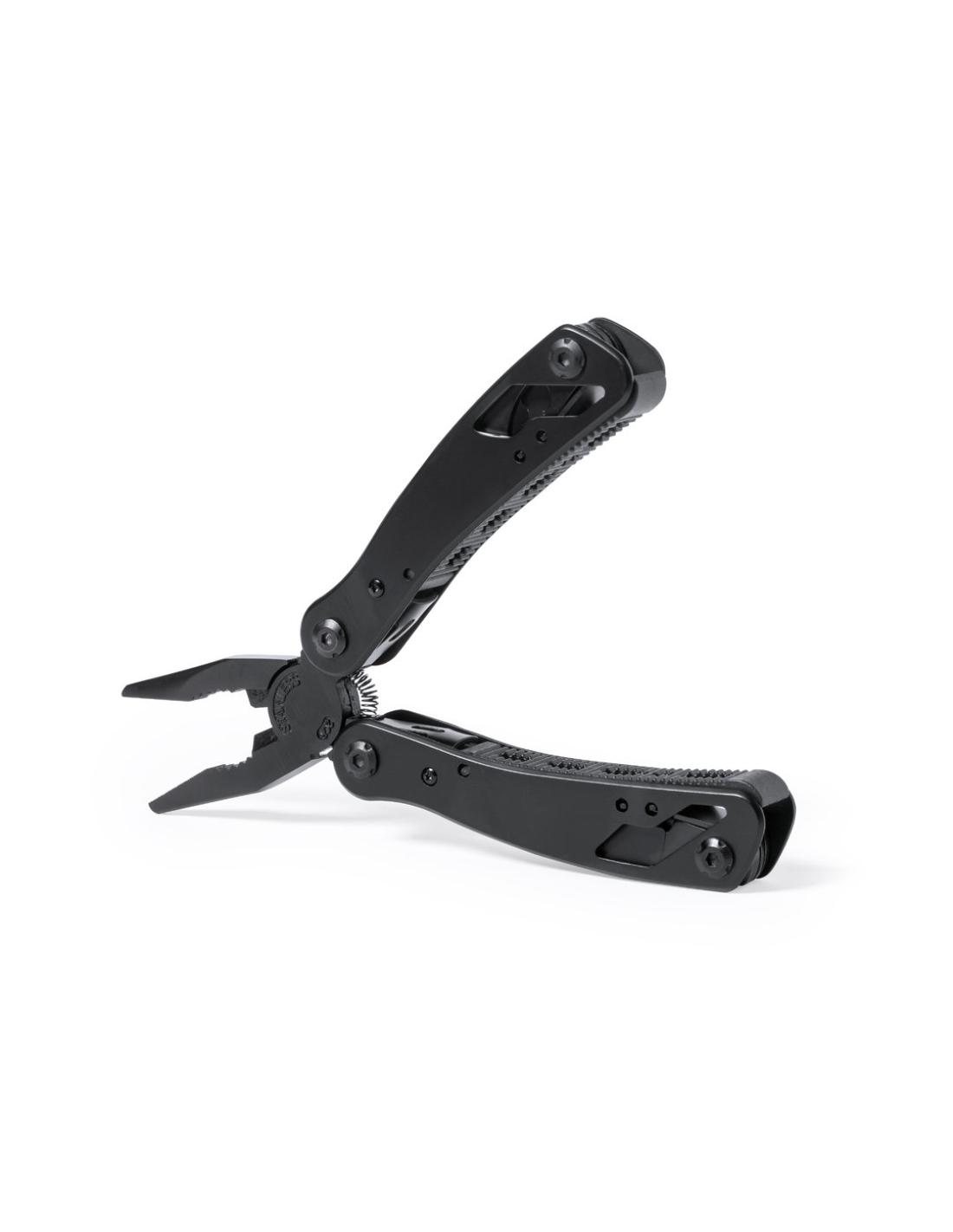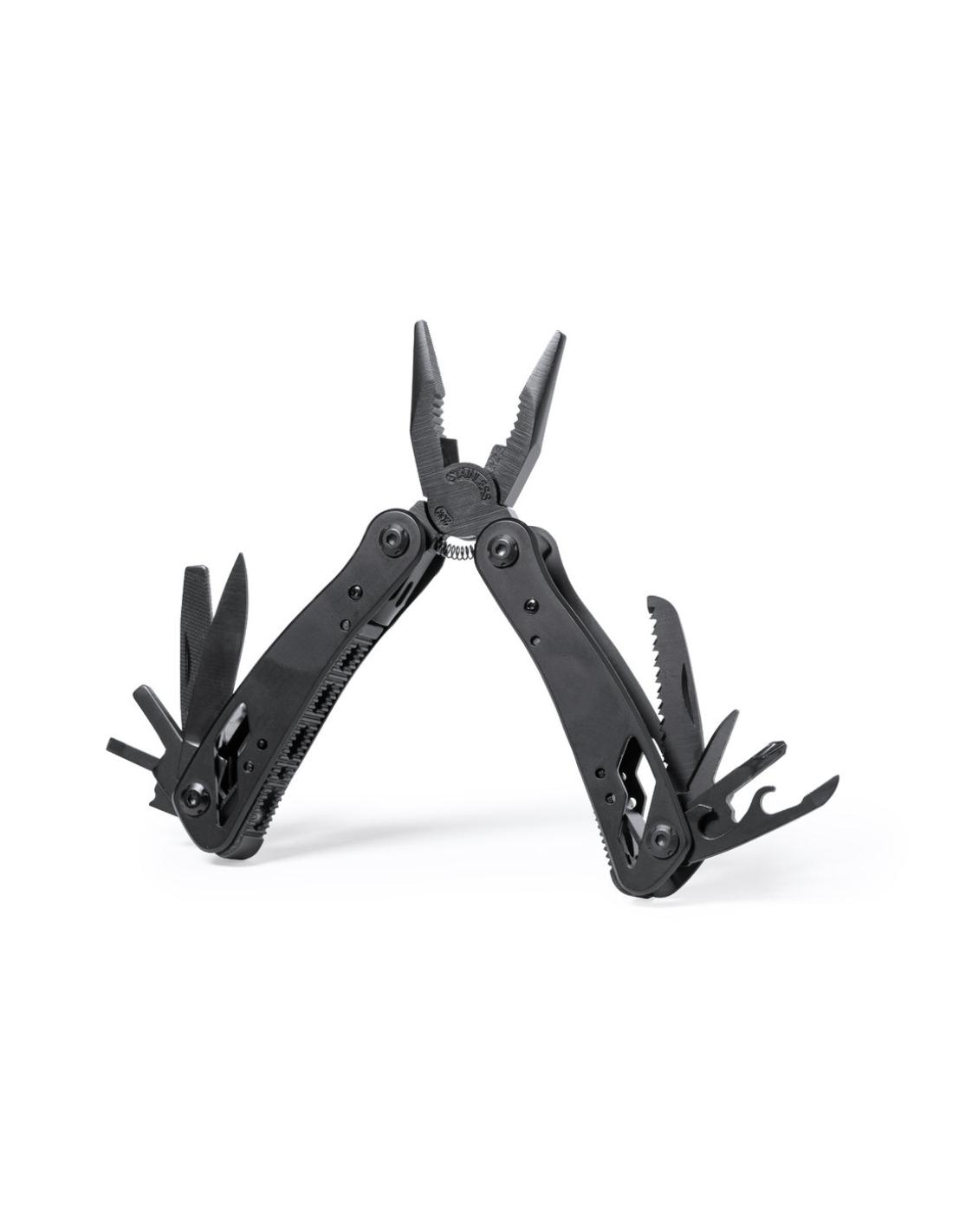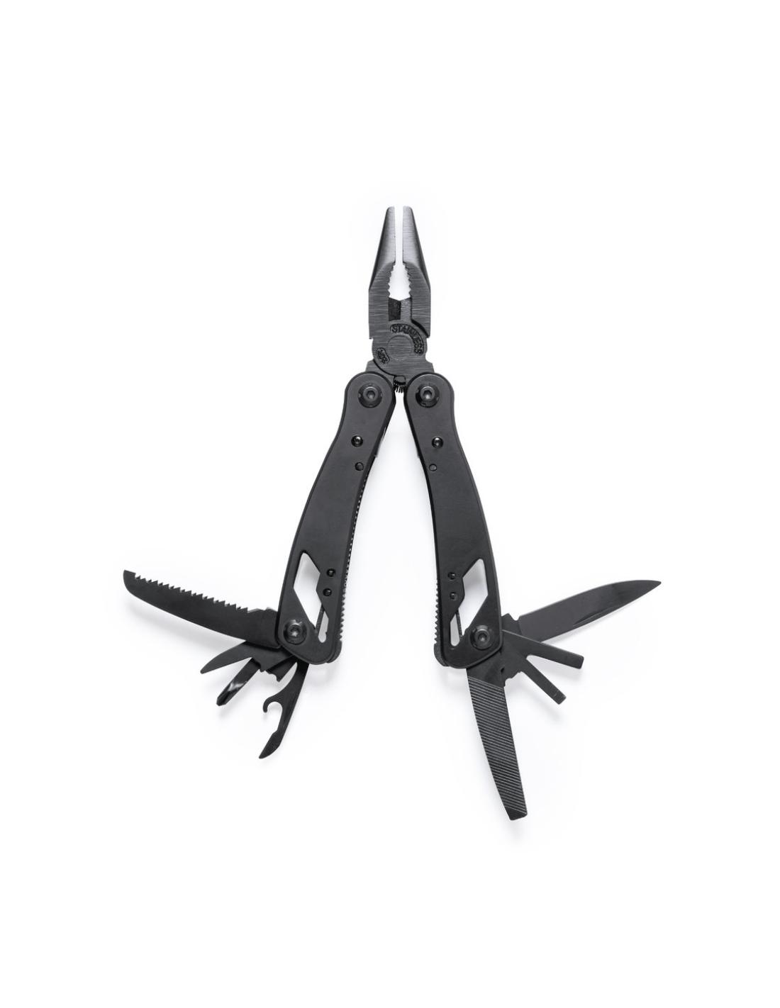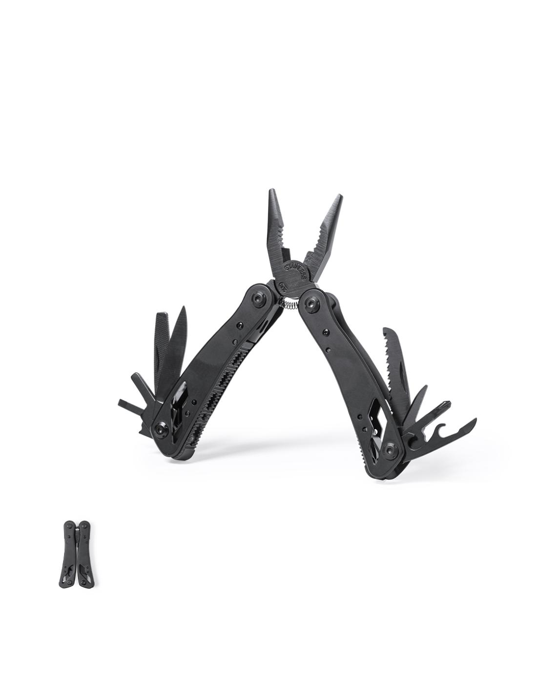 Multiherramienta con accesorios en acero inox de acabado negro y resistente empuñadura a juego en aluminio. Con 13 funciones, entre ellas cuchillo y navaja destornillador, lima abridor y alicates. Plegable y de tamaño compacto, presentada en caja individual de diseño negra.