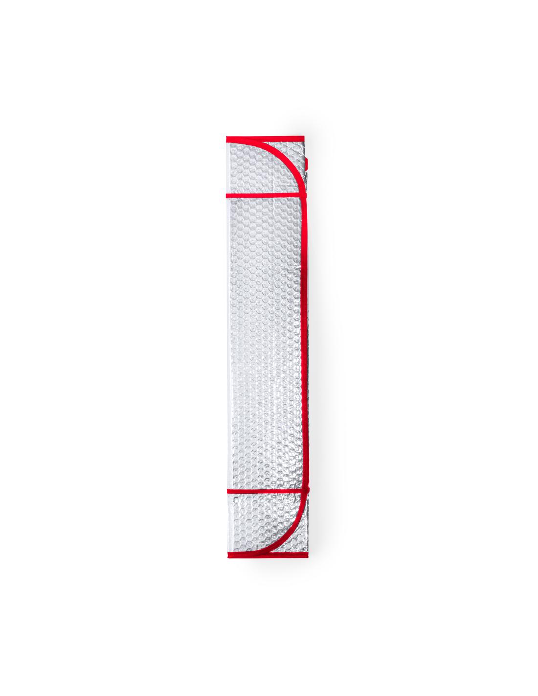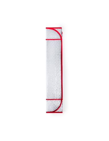 Parasol en aluminio con burbuja en ambas caras. Acabado plateado metalizado, con ribetes en color negro y en tamaño 130 x 70 cm. Con cintas elásticas para plegado y presentación desplegado en plancha para fácil impresión, con bolsas aparte.