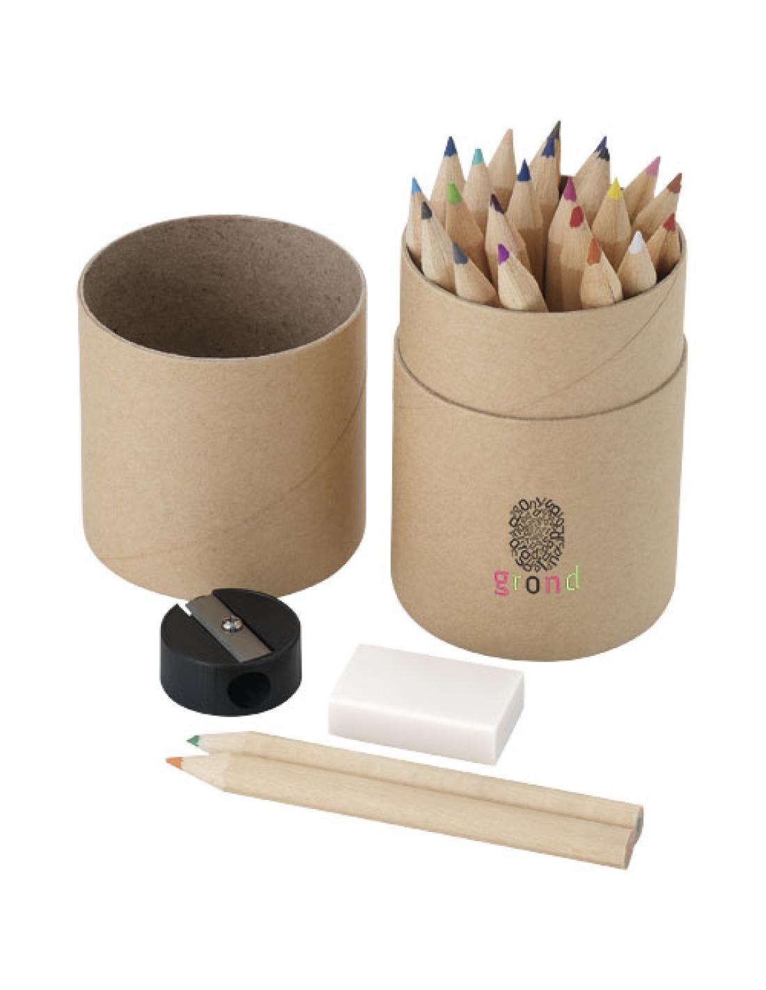 26 lápices de colores, goma de borrar y sacapuntas en una caja cilíndrica de cartón. No permite la grabación de los componentes.