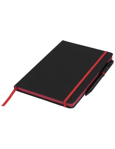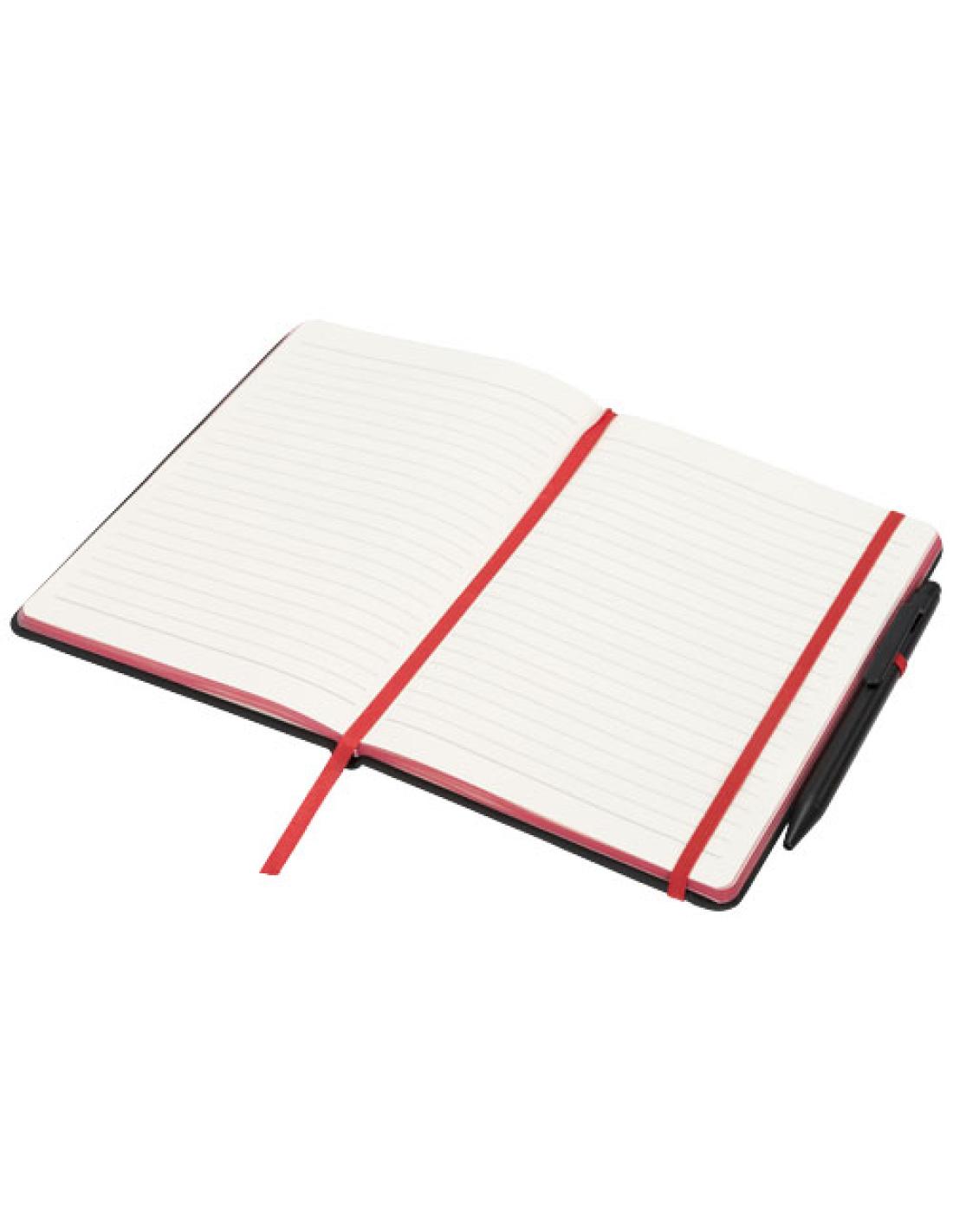 Una moderna y elegante libreta negra con una suave tapa táctil. Se suministra con ribetes de color y marcapáginas, soporte para bolígrafo y tira de cierre a juego. Se suministra con un bolígrafos-stylus de color negro. Contiene 96 hojas (70 g/m2) de papel rayado en tono crema.