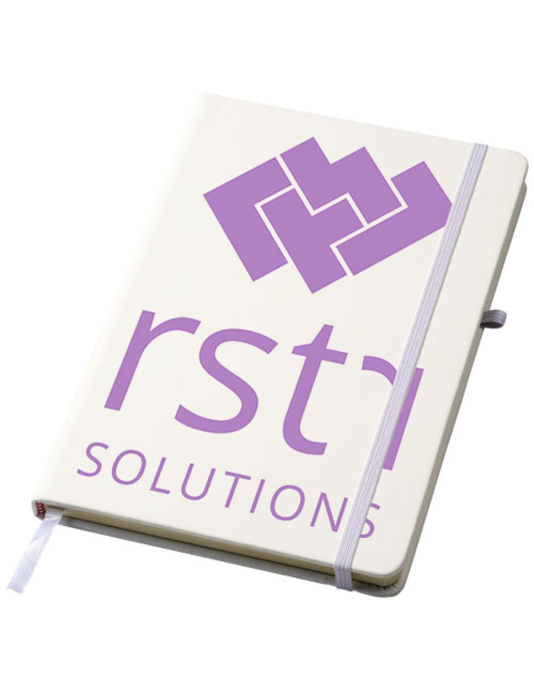 Libreta A5 con cierre elástico de color a juego, soporte para bolígrafo y cinta. Incluye 96 hojas de papel con líneas de 70 g/m2. Cubierta de PU de tacto suave.