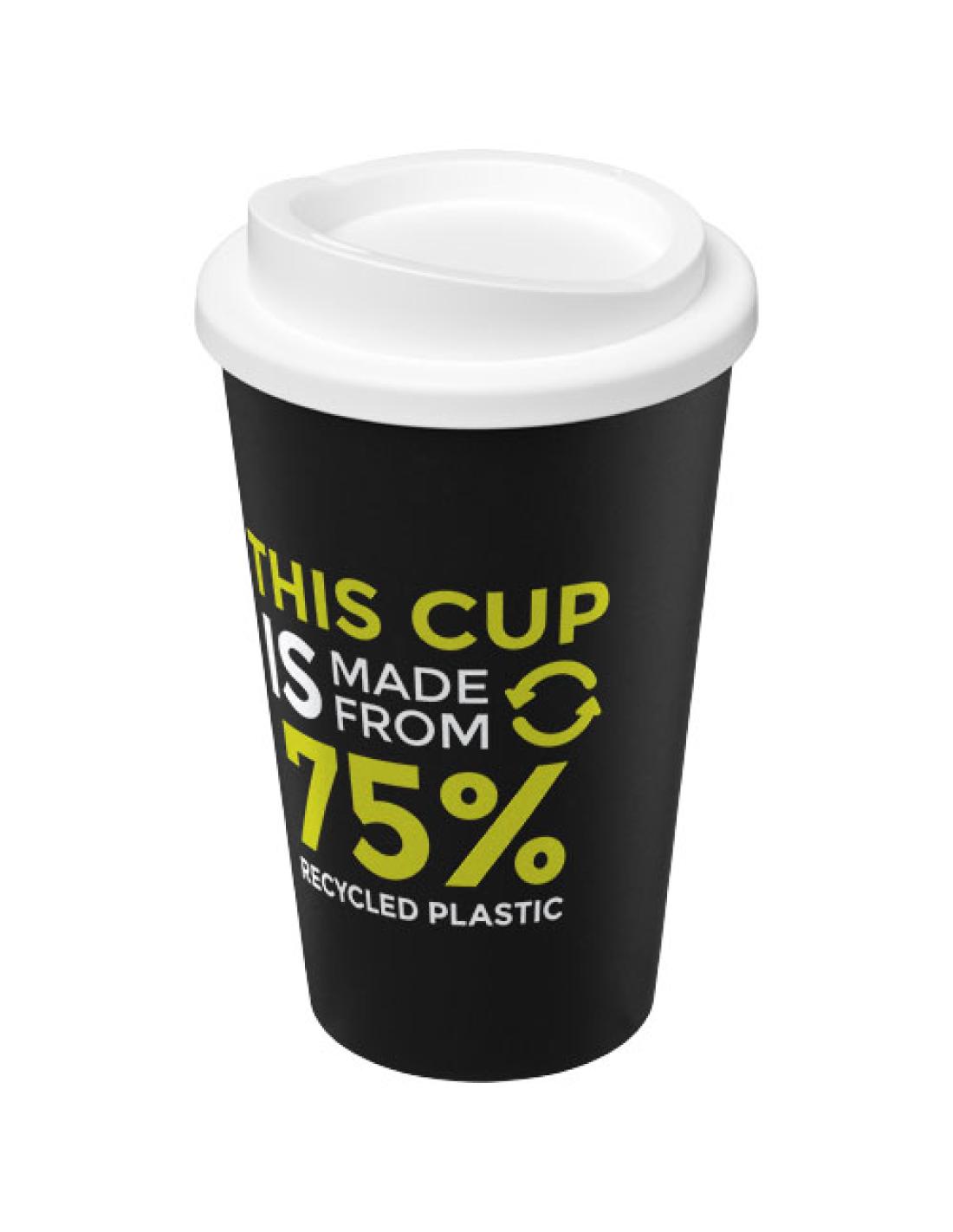 Vaso con aislamiento de doble capa con tapa de rosca. El vaso está hecho de plástico de polipropileno 75 % reciclado, con una capa interior negra, mientras que la tapa está hecha de plástico de polipropileno de grado alimenticio. Dado que la tapa no está hecha de material reciclado, está disponible en una amplia gama de colores diferentes. Los tonos en negro o blanco pueden variar, la opción blanca tiene un efecto de textura y puede incluir tintes de color debido a la naturaleza del material reciclado. Capacidad de 350 ml. Fabricado en el Reino Unido. Embalado en una bolsa compostable.