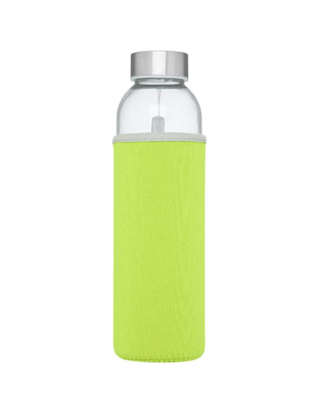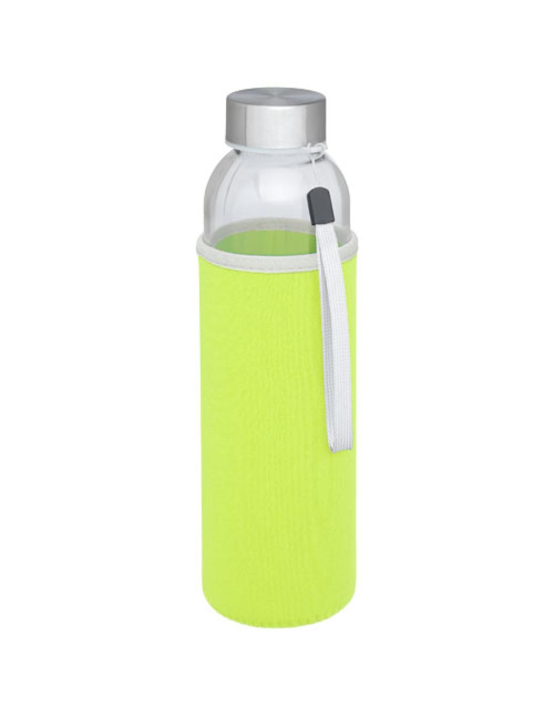 Botella de vidrio de una sola pared con tapa de rosca. La tapa cuenta con una correa para facilitar el transporte, así como una funda de neopreno. Recomendado para bebidas frías. No apto para congelar ni para el microondas. Capacidad de 500 ml. Se presenta en una caja de regalo.
