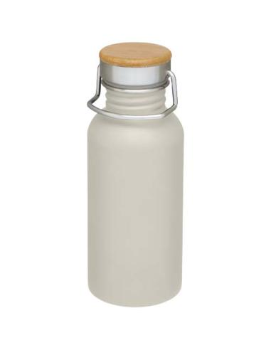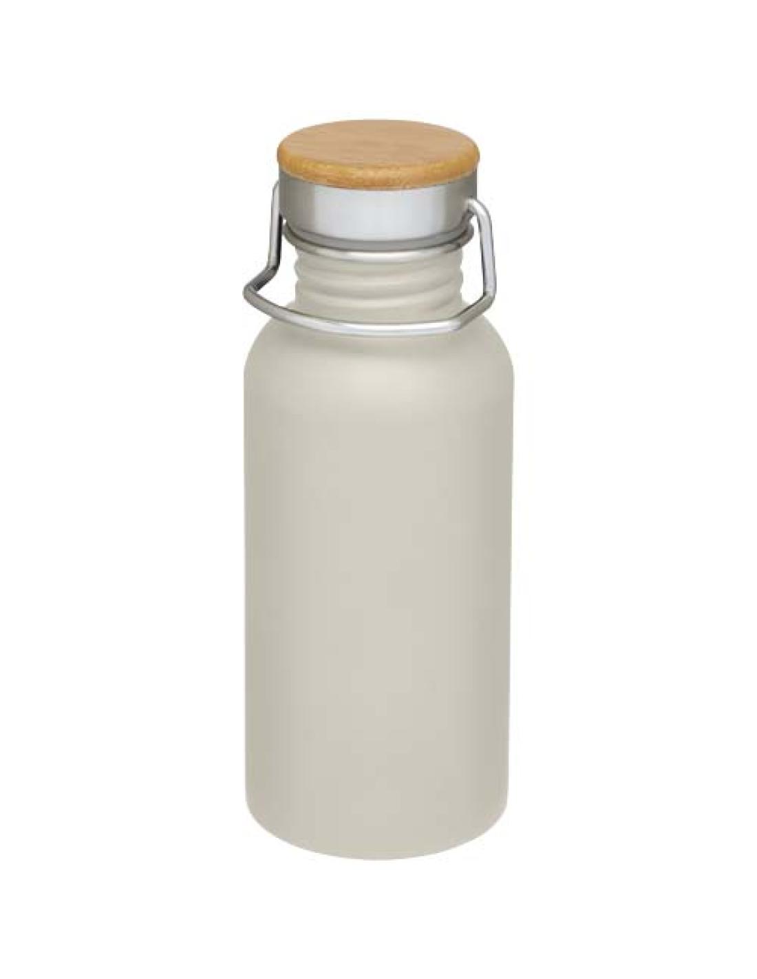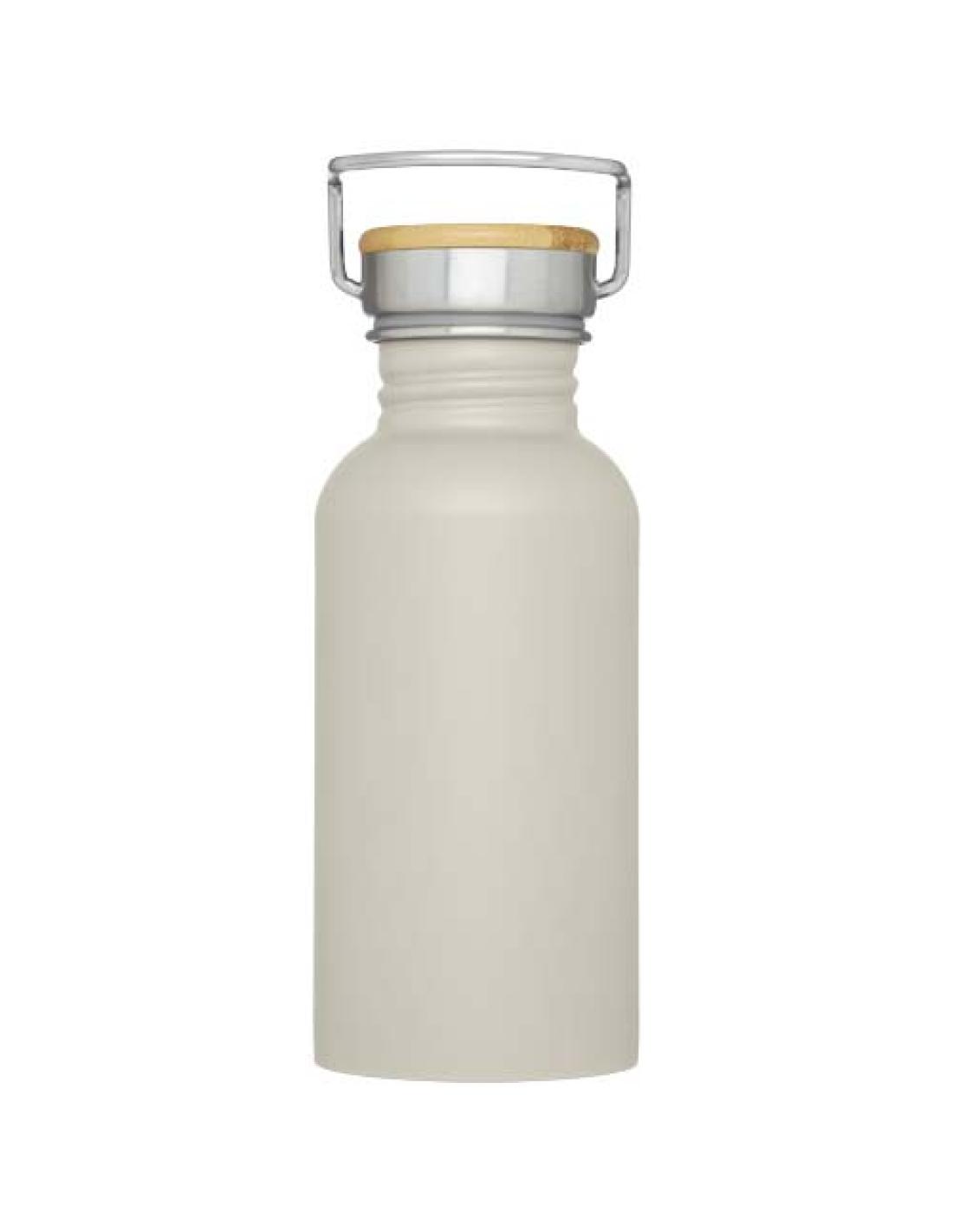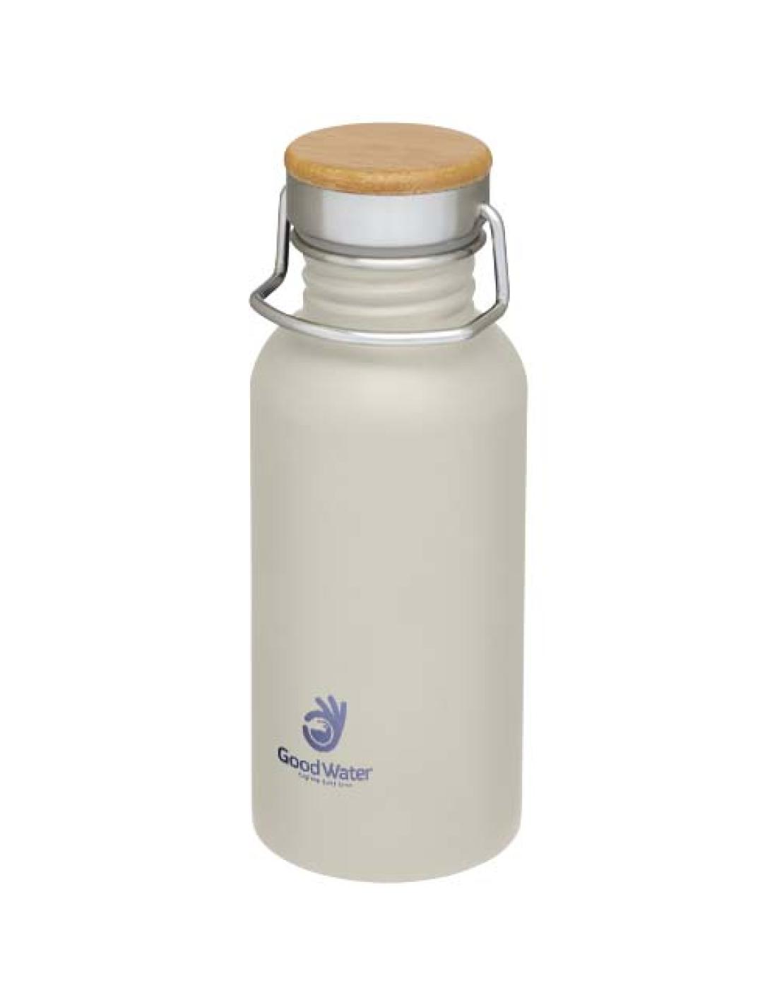 Botella de acero inoxidable de una sola pared con tapa de rosca. La parte superior de la tapa es de bambú, y lleva un asa para facilitar el transporte. Capacidad de 550 ml. Se presenta en una caja de regalo "Avenue".