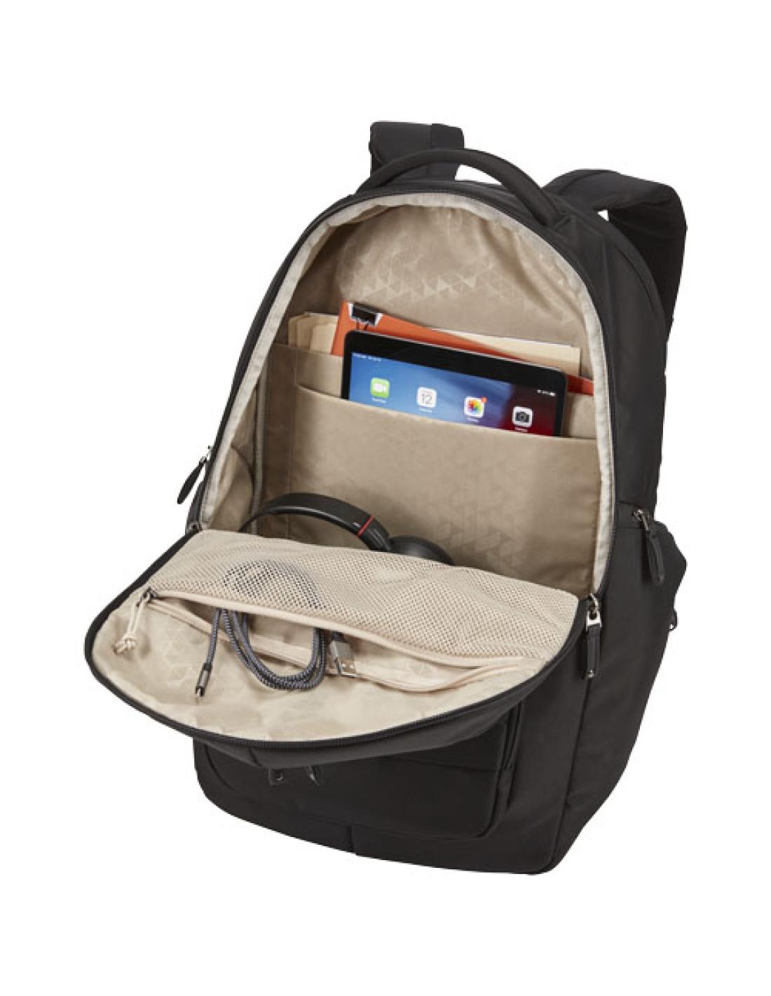 Cuenta con un gran compartimento principal con cremallera, una funda acolchada para portátil de 17,3" y para tableta de 10,1", así como con un bolsillo de malla con cremallera para cables y accesorios. Incluye un panel de organización frontal para guardar pequeños componentes electrónicos, cables, accesorios, tarjetas de visita y llaves. Contiene bolsillos laterales ampliables para una botella de agua o cargador de portátil, correas acolchadas para los hombros, panel posterior de malla acolchado con aire, asa suave y guía para acoplarla a una mochila con ruedas. Garantía Case Logic: 25 años.