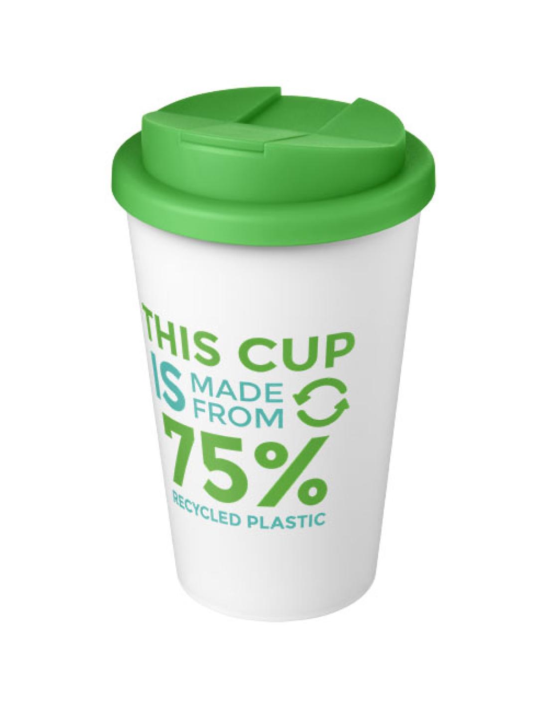 Vaso con aislamiento de doble pared y tapa de rosca segura a prueba de derrames y capa interna negra. Los clips de la tapa se cierran para evitar derrames, y están fabricados sin silicona para que el vaso sea totalmente reciclable. El vaso está hecho de plástico PP 75 % reciclado y la tapa de plástico PP de grado alimenticio. Los tonos en negro o blanco pueden variar, la opción blanca tiene un efecto de textura y puede incluir tintes de color debido a la naturaleza del material reciclado. Cumple con la norma EN12875-1, es apto para el lavavajillas y el microondas. Capacidad de 350 ml. Suministrado en una bolsa compostable. Fabricado en el Reino Unido. Sin BPA