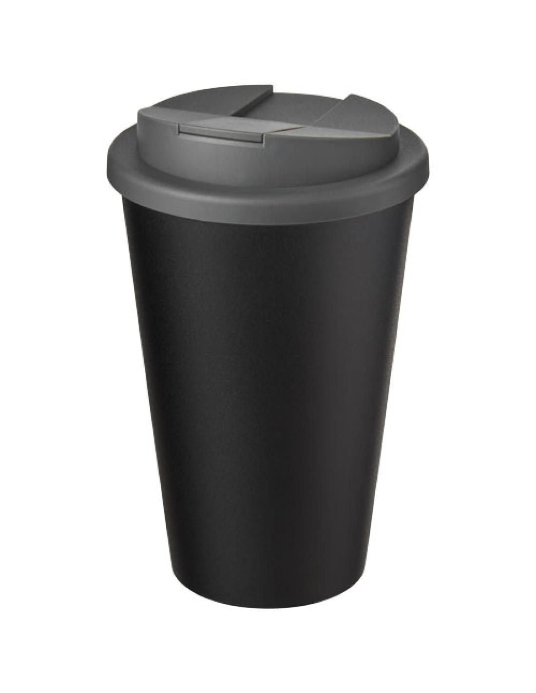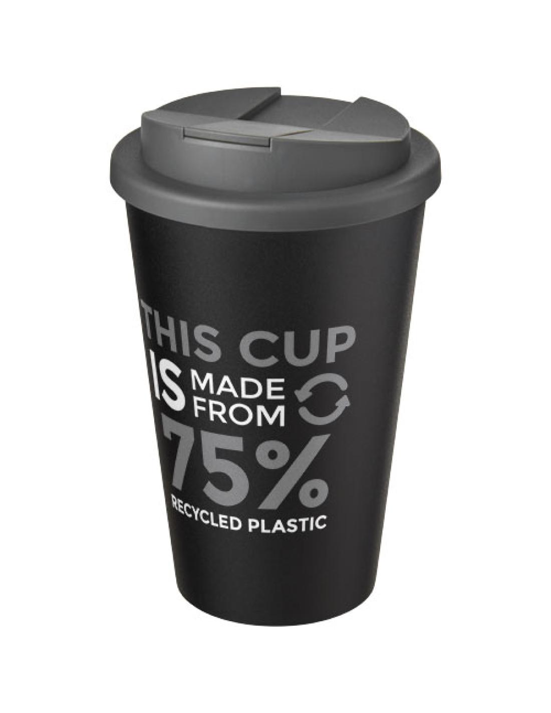 Vaso con aislamiento de doble pared y tapa de rosca segura a prueba de derrames y capa interna negra. Los clips de la tapa se cierran para evitar derrames, y están fabricados sin silicona para que el vaso sea totalmente reciclable. El vaso está hecho de plástico PP 75 % reciclado y la tapa de plástico PP de grado alimenticio. Los tonos en negro o blanco pueden variar, la opción blanca tiene un efecto de textura y puede incluir tintes de color debido a la naturaleza del material reciclado. Cumple con la norma EN12875-1, es apto para el lavavajillas y el microondas. Capacidad de 350 ml. Suministrado en una bolsa compostable. Fabricado en el Reino Unido. Sin BPA