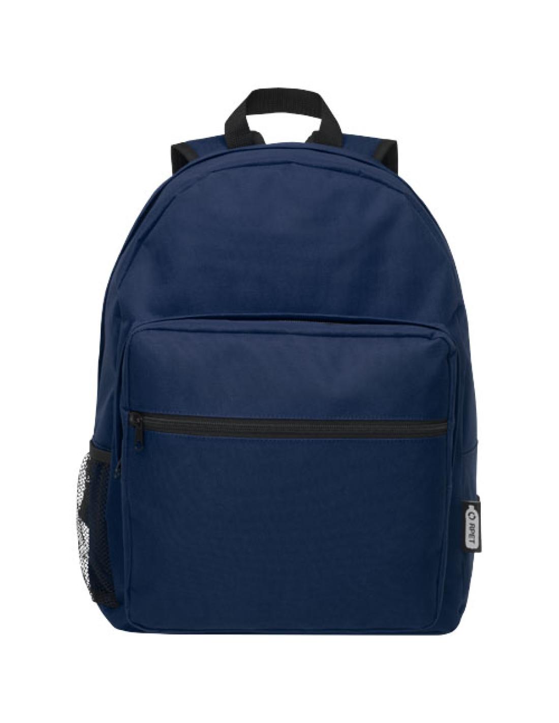 Resistente mochila de plástico 100 % reciclado, que contribuye a la reducción de los desechos plásticos. Cuenta con correas de hombro ajustables, dos compartimentos con cremallera y un bolsillo frontal con cremallera. Para fabricar esta bolsa se reciclaron aproximadamente 15 botellas.