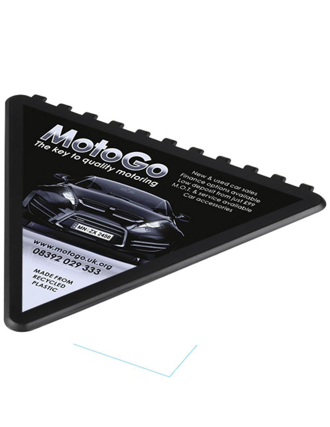 Rascador de parabrisas de forma triangular con una gran superficie de decoración. Cada uno de los 3 lados puede utilizarse para eliminar el hielo del parabrisas. Presenta un acabado moteado por su naturaleza reciclada. Fabricado en el Reino Unido con plástico reciclado.