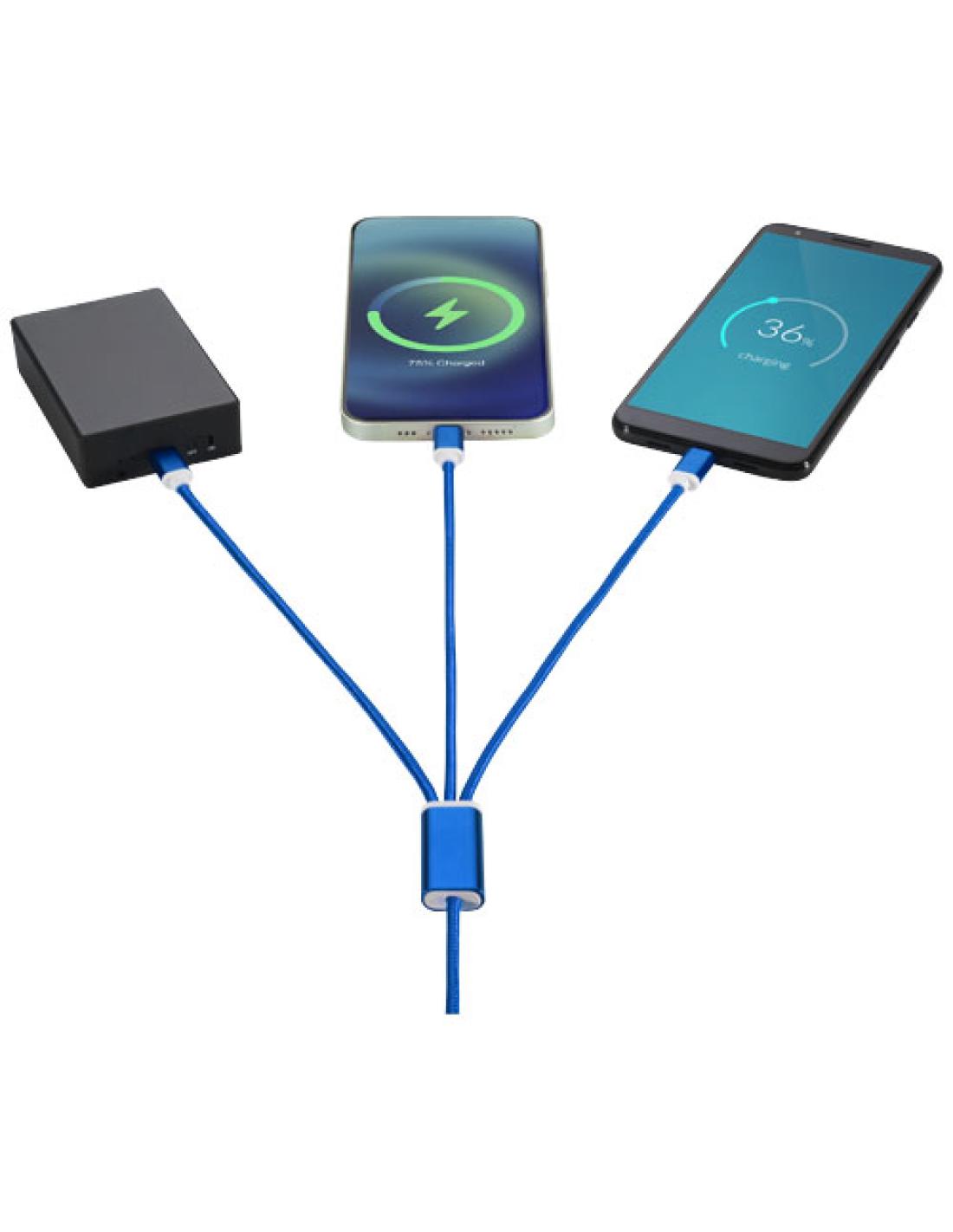 Cable de carga de nylon trenzado con cinco conectores: entrada de tipo C, entrada USB-A, salida de tipo C, salida para Apple® iOS y salida micro USB. Esto permite utilizar el cable también con dispositivos de salida tipo C que se incluyen en la nueva generación de teléfonos y ordenadores MacBook. La longitud del cable es de 100 cm. La salida del extremo es de 2 en 1 de hasta 2A. Salida de tipo C de corriente hasta 3A.