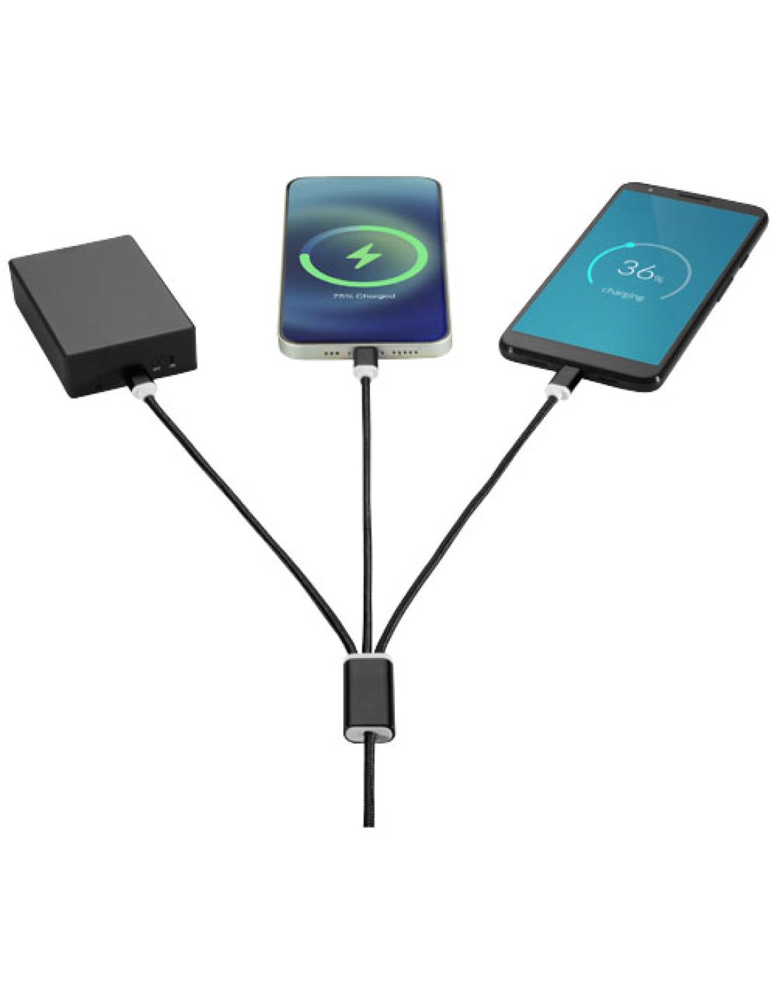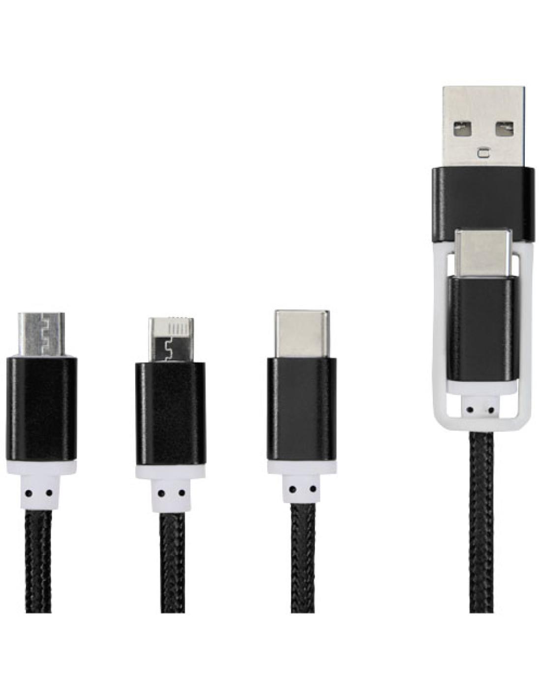 Cable de carga de nylon trenzado con cinco conectores: entrada de tipo C, entrada USB-A, salida de tipo C, salida para Apple® iOS y salida micro USB. Esto permite utilizar el cable también con dispositivos de salida tipo C que se incluyen en la nueva generación de teléfonos y ordenadores MacBook. La longitud del cable es de 100 cm. La salida del extremo es de 2 en 1 de hasta 2A. Salida de tipo C de corriente hasta 3A.