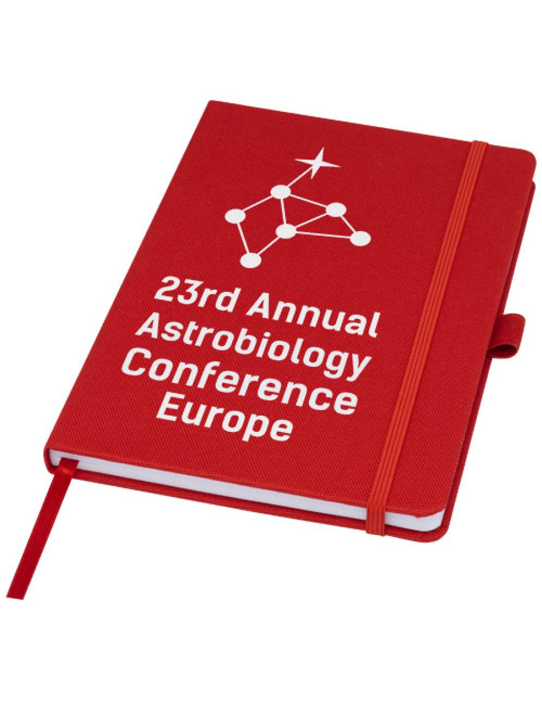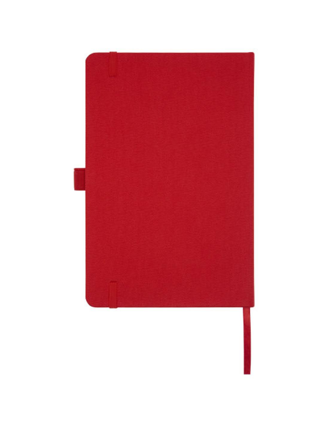 Libreta de tamaño A5 con tapa de tejido de RPET. Cuenta con 80 hojas de papel reciclado de 70 g/m² con diseño rayado, soporte para bolígrafo y cinta marcapáginas. Puede combinarse con el bolígrafo de RPET 107757 "Honua".