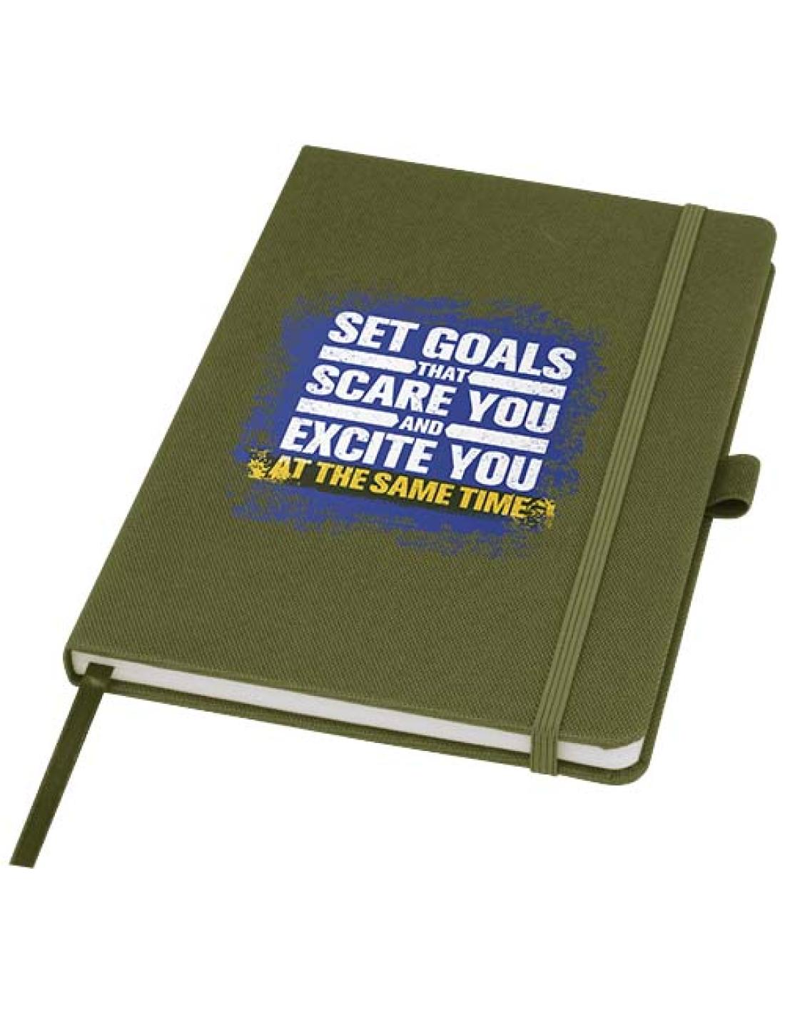 Libreta de tamaño A5 con tapa de tejido de RPET. Cuenta con 80 hojas de papel reciclado de 70 g/m² con diseño rayado, soporte para bolígrafo y cinta marcapáginas. Puede combinarse con el bolígrafo de RPET 107757 "Honua".
