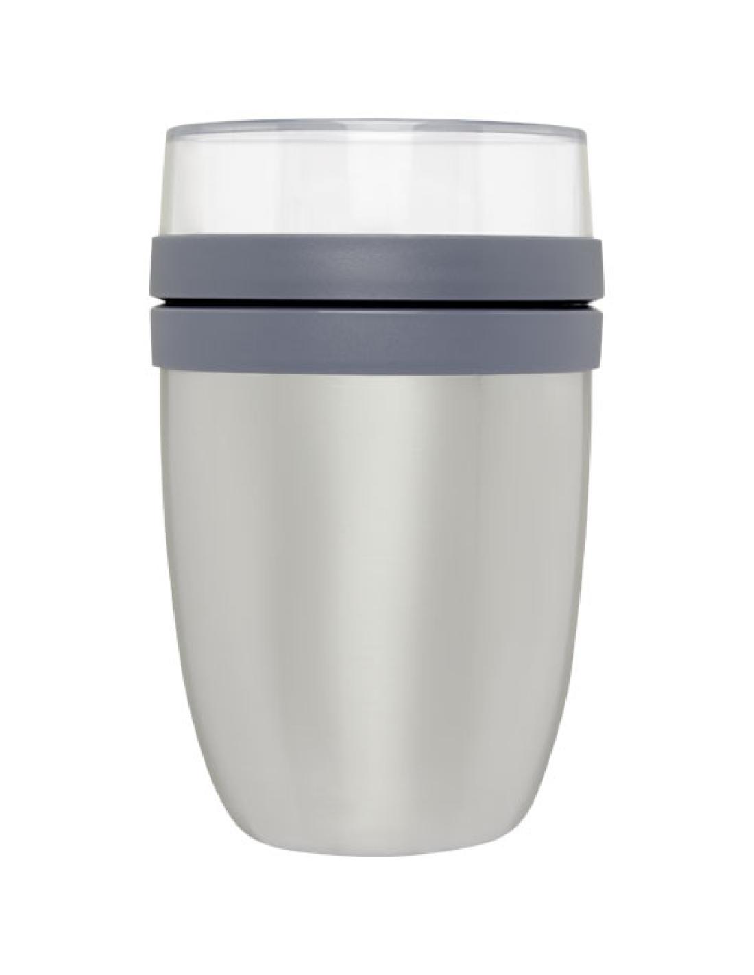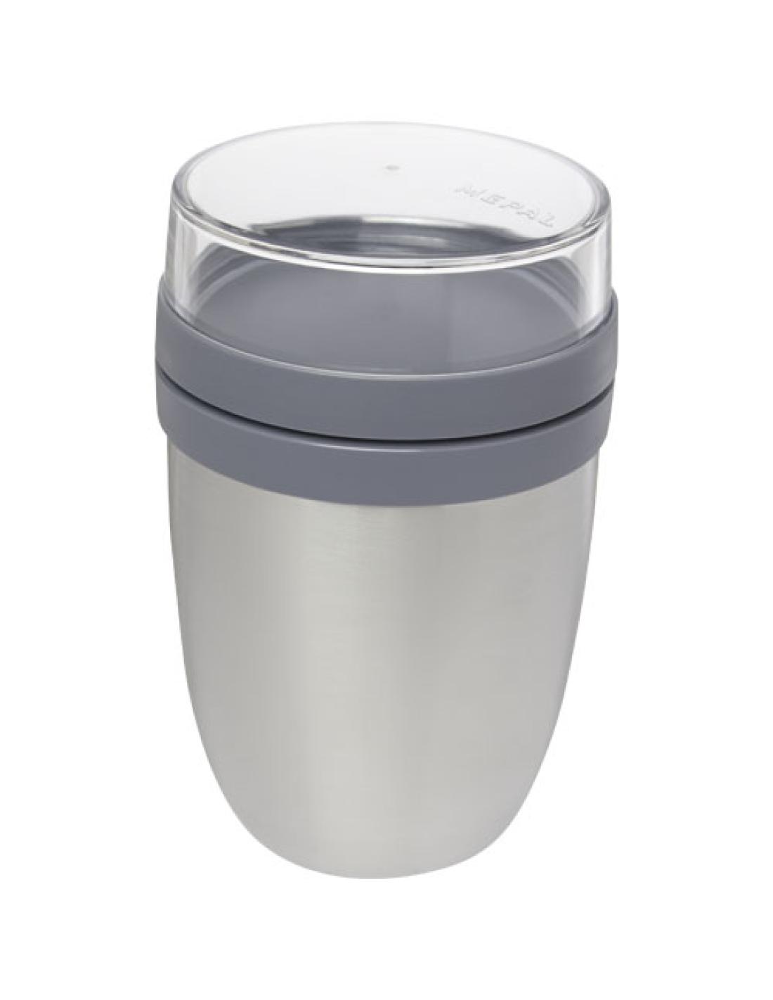 Fiambrera con aislamiento y dos compartimentos para mantener los ingredientes separados. Ambos recipientes tienen una tapa separada para que los ingredientes no se mezclen. Mantiene la comida caliente durante diez horas y fría durante dieciséis horas. Para que la comida se mantenga caliente o fría el mayor tiempo posible, se recomienda enjuagar la fiambrera con agua caliente o fría antes de llenarla. El contenido del recipiente transparente superior es de 200 ml, lo que significa que puede contener unos 75 gramos de alimentos sólidos. La capacidad del recipiente inferior es de 500 ml. De material duradero, el exterior de la fiambrera se mantiene fresco y seco. Se recomienda lavarla a mano. Las partes de plástico del tapón se pueden lavar en el lavavajillas. Hermética. Sin BPA. Garantía Mepal de 2 años.