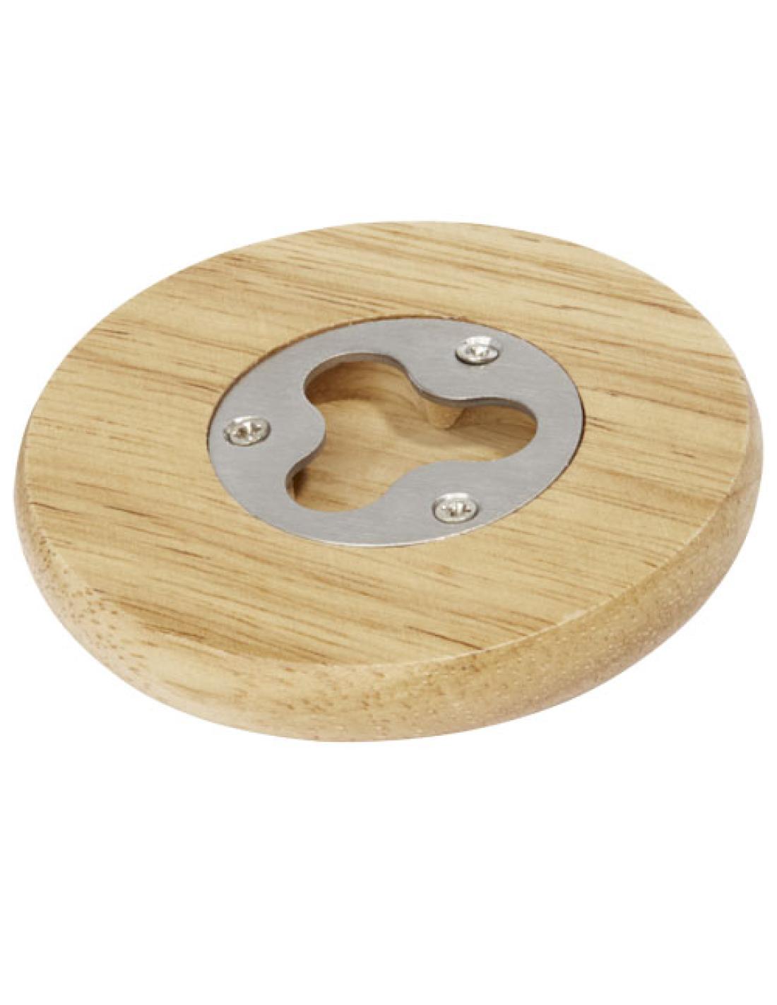 Posavasos de madera con abrebotellas de acero inoxidable.