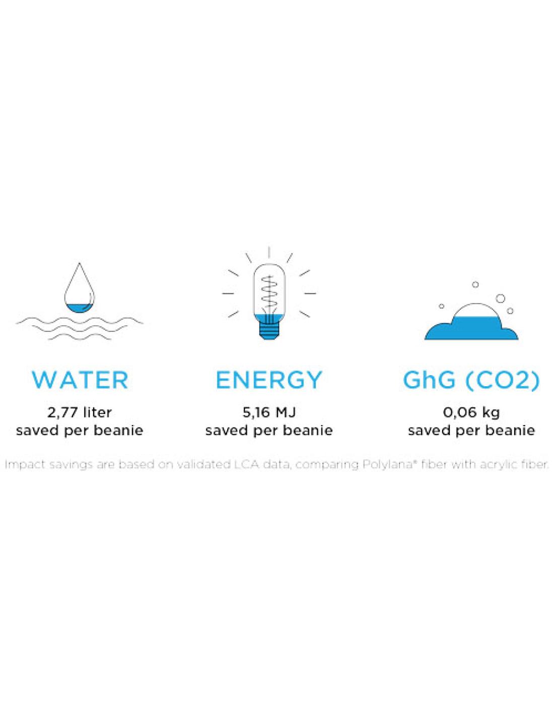 El gorro Hale está fabricado en fibra Polylana® -una alternativa de bajo impacto a las fibras 100% acrílicas y de lana- que permite ahorrar agua y energía así como reducir la emisión de CO2 durante el proceso de producción y teñido. En comparación con la fibra acrílica, por cada gorro Hale se ahorran los siguientes impactos: 2,77 litros de agua, 5,16 MJ de energía y 0,06 kg de GhG (CO2), este ahorro se basa en datos validados del Análisis del Ciclo de Vida (ACV). Fabricado en punto de canalé 1x1 con fibra Polylana® y acrílico con una densidad de galga 12. La elección ideal para quienes valoran la moda cuidando el medio ambiente.