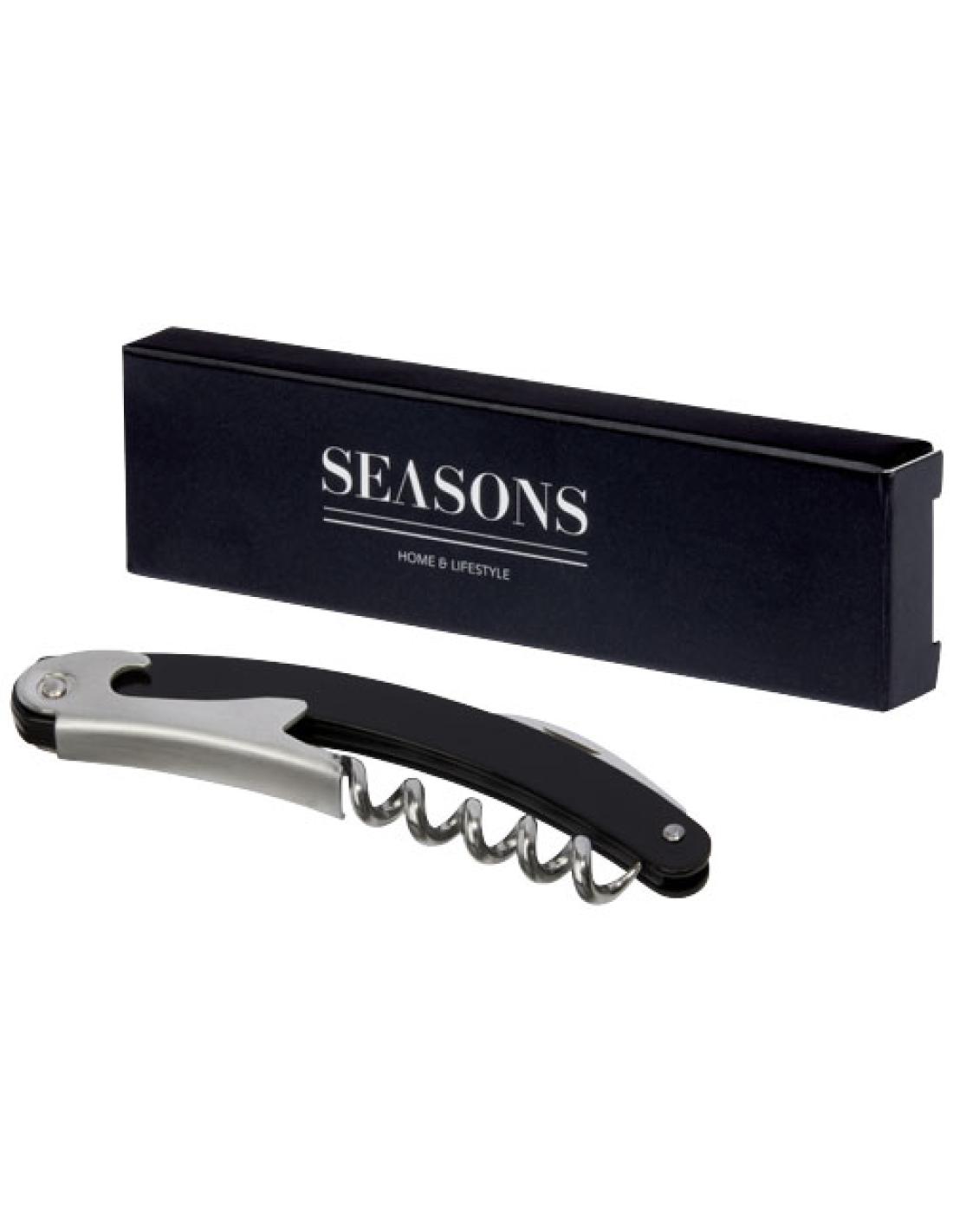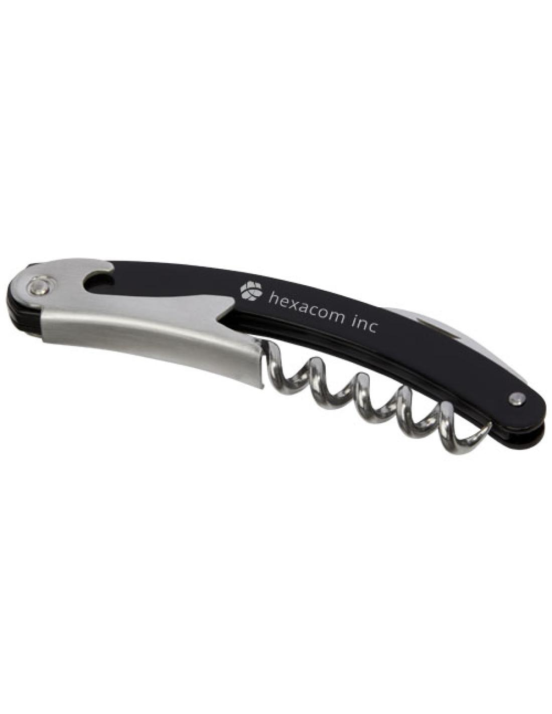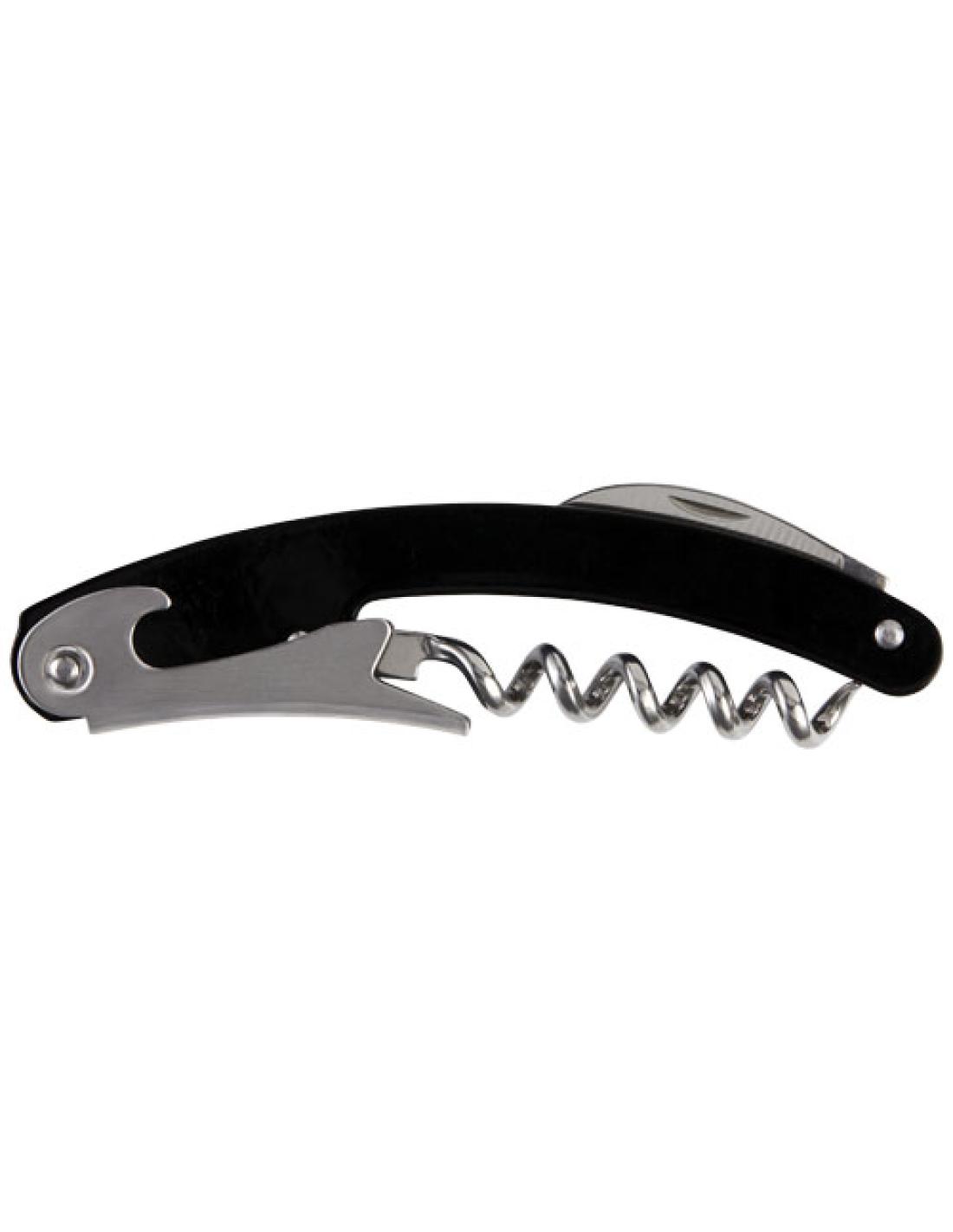 Una herramienta profesional de acero inoxidable con cuerpo de color, cortacápsulas y abrebotellas.
