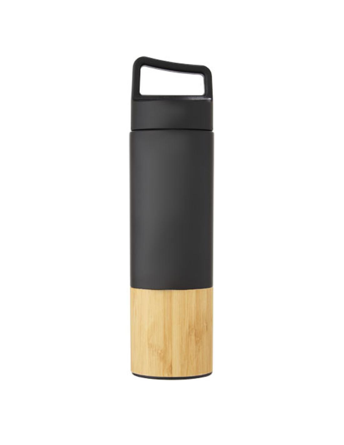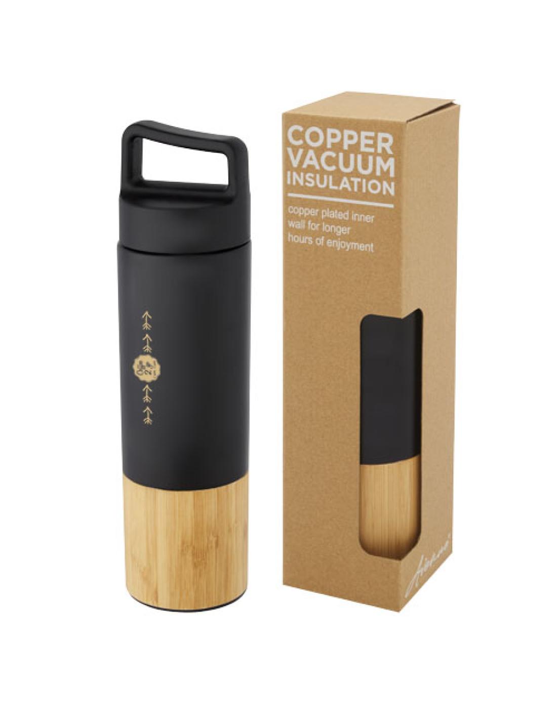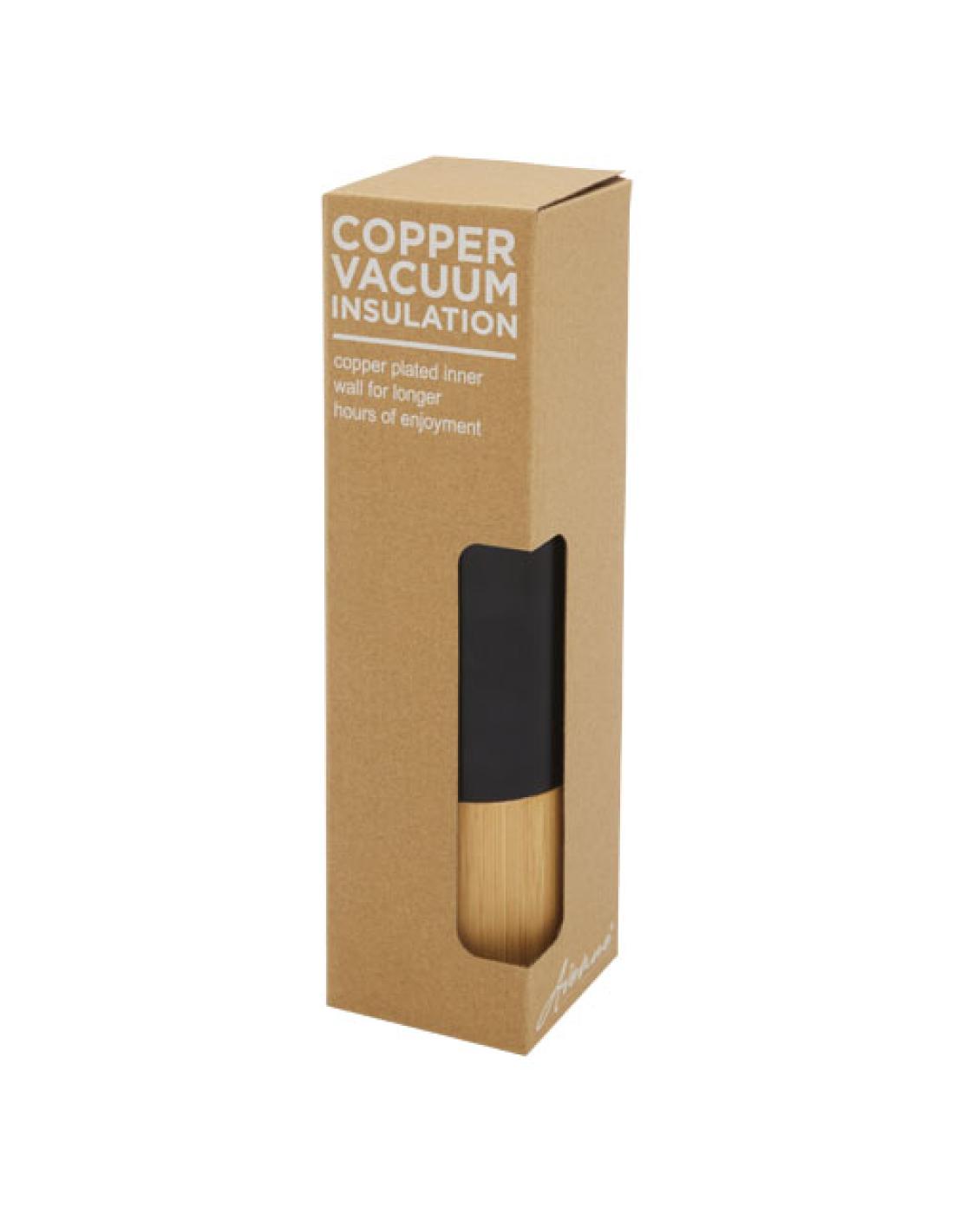 Botella de acero inoxidable 18/8 con aislamiento al vacío de cobre que mantiene las bebidas calientes o frías durante varias horas. Cuenta con un moderno detalle de bambú, y gracias al asa en la parte superior de la tapa es fácil de llevar. La botella tiene una amplia abertura que facilita el llenado y la limpieza. Probado y homologado conforme a la legislación alemana sobre seguridad alimentaria (LFGB), y comprobado el contenido de ftalatos según la normativa REACH. Tiene una capacidad de 540 ml. Se presenta en una caja de regalo de cartón reciclado.