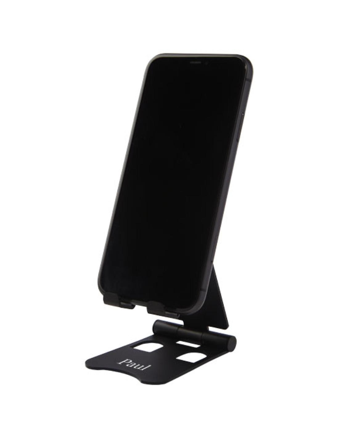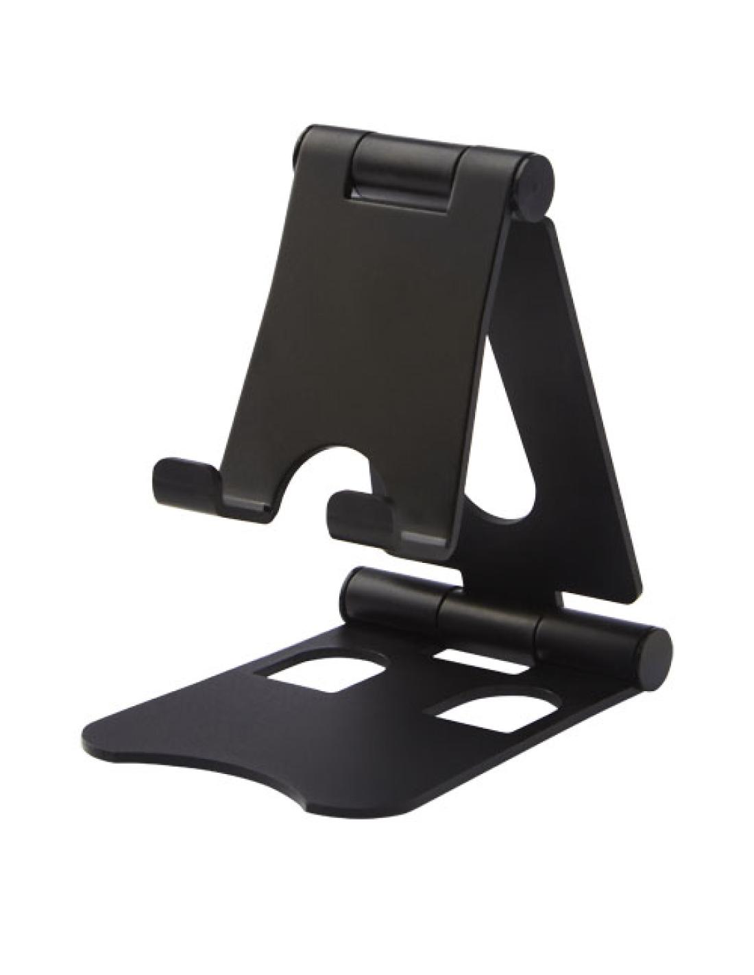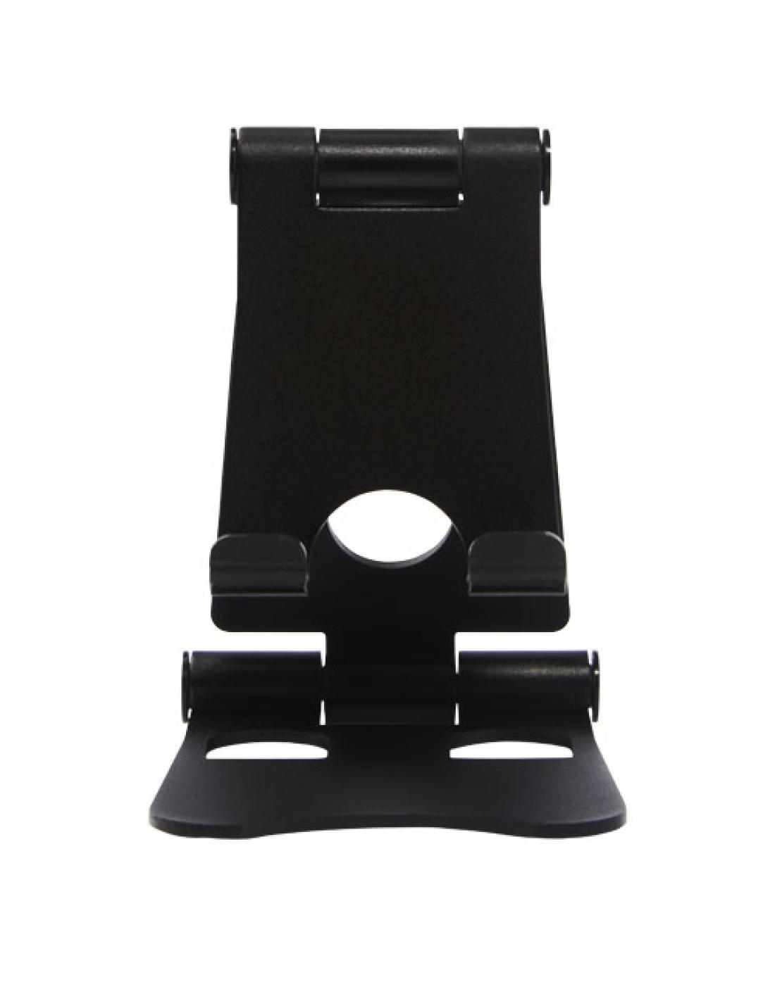 Soporte para teléfono plegable de aluminio. Tanto la altura como el ángulo de visión pueden ajustarse, lo que lo convierte en el accesorio perfecto para las conferencias telefónicas, las retransmisiones, las difusiones en directo o simplemente para ver una película. La base tiene material antideslizante para evitar que se mueva. Se entrega en una caja de papel kraft de primera calidad con una pegatina de colores.