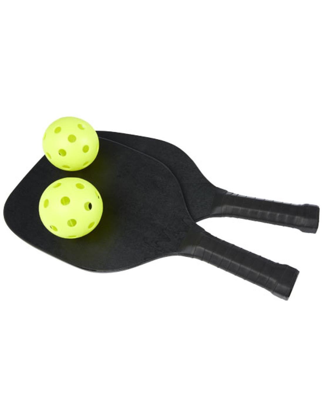 Este set de palas de madera de álamo proporciona mucha diversión y ejercicio para dos en la playa, en el parque o en el jardín. Las palas tienen un tamaño de 40 x 20 x 0,7 cm y están pintadas de color negro, por lo que proporcionan una gran superficie para grabar cualquier logotipo. Las asas están envueltas con cinta de poliuretano que ofrece un agarre máximo durante las sesiones de juego intensas. El set se completa con 2 bolas de material PP y se presenta en una bolsa de almacenamiento de poliéster de malla con un tamaño de 45 x 26 cm. ¡Advertencia! No apto para niños menores de tres años. Piezas pequeñas. Peligro de asfixia.