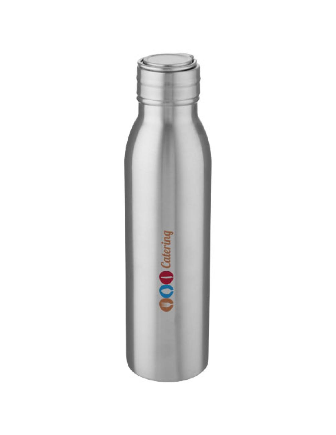 Botella deportiva de acero inoxidable 18/8 de una sola pared con tapa de rosca a prueba de derrames y asa de mano de aleación de zinc resistente. No contiene BPA y se ha probado y homologado según la legislación alemana sobre seguridad alimentaria (LFGB). Contenido de ftalatos probado y homologado según la normativa REACH. Se adapta a la mayoría de los portavasos de coche. Capacidad de 700 ml. Se recomienda lavarla a mano. Se presenta en una caja de regalo de cartón reciclado.