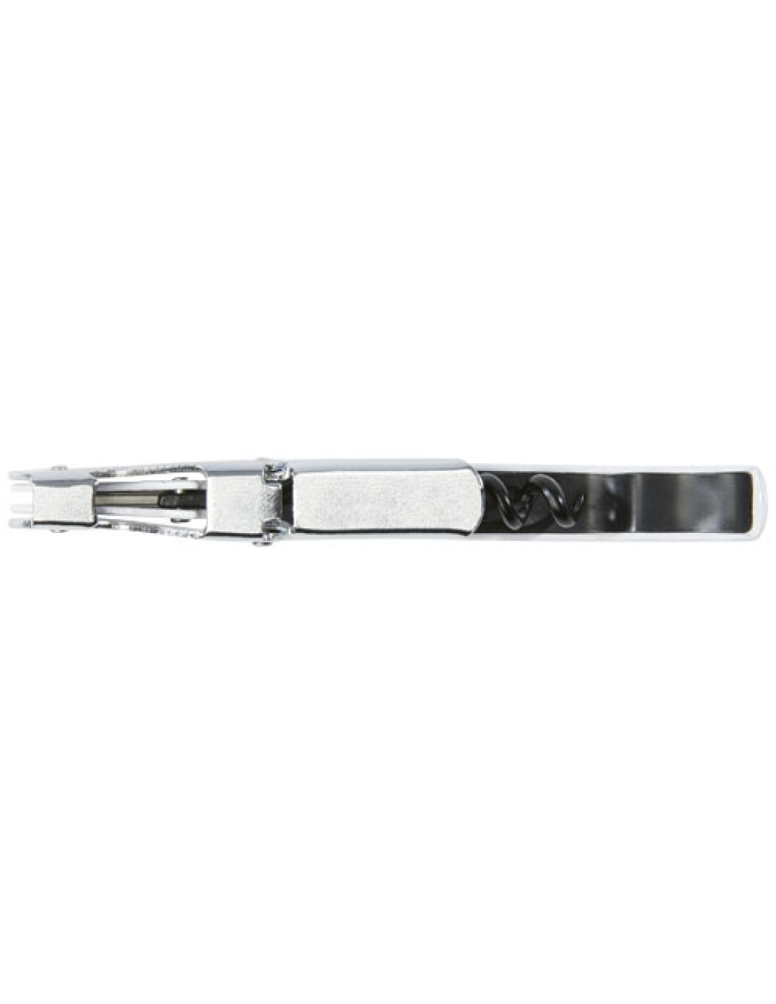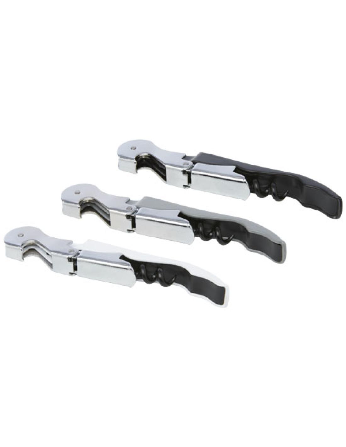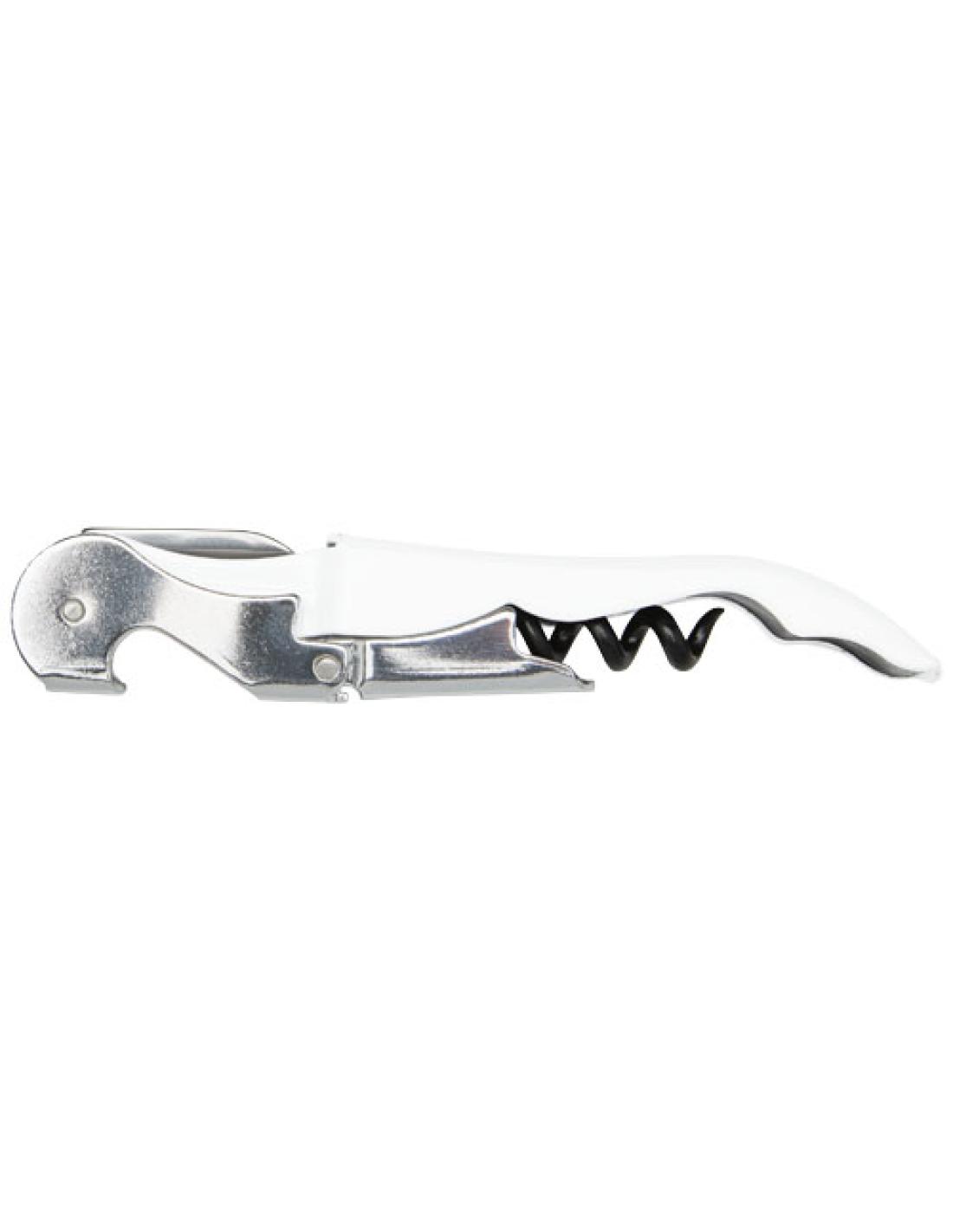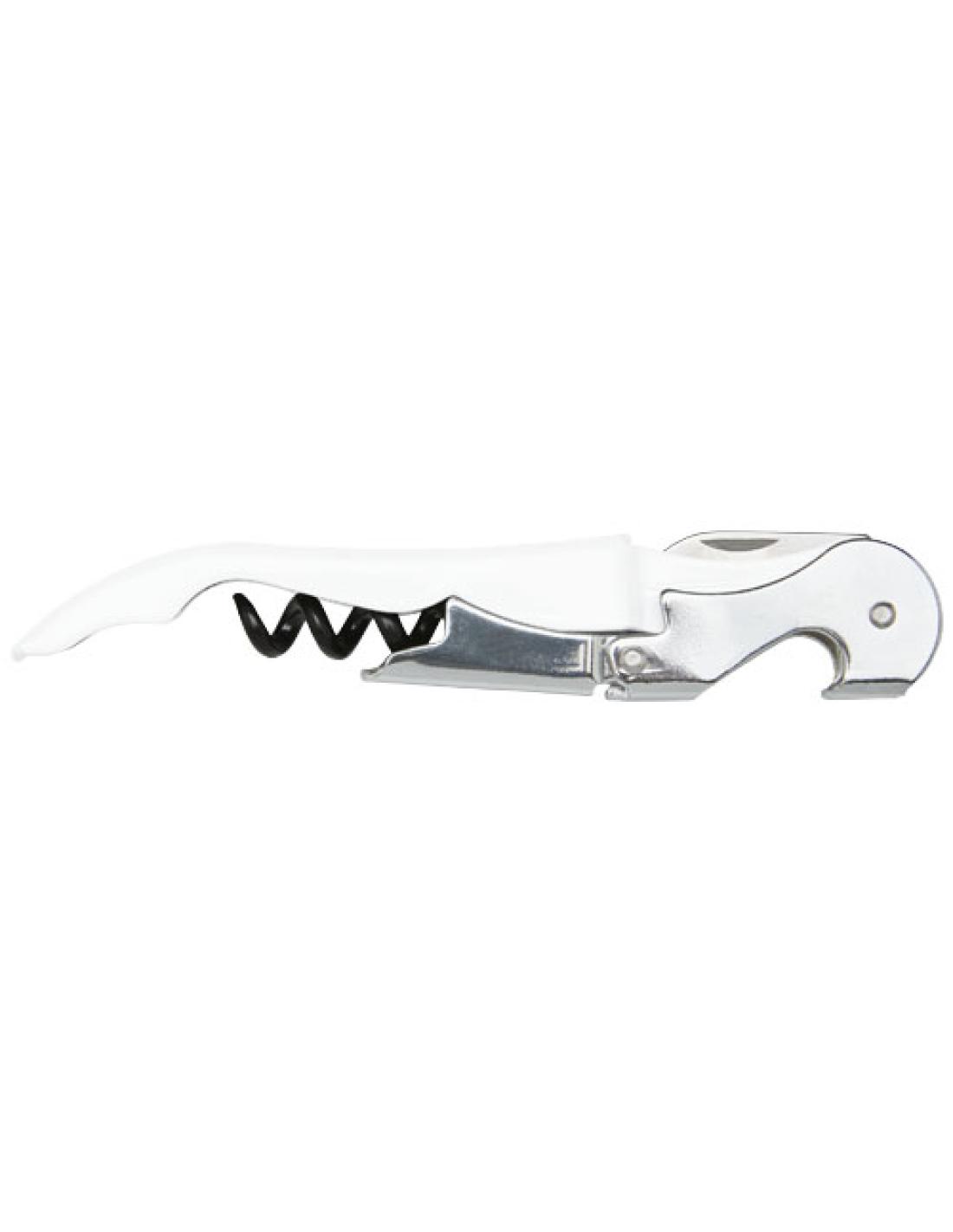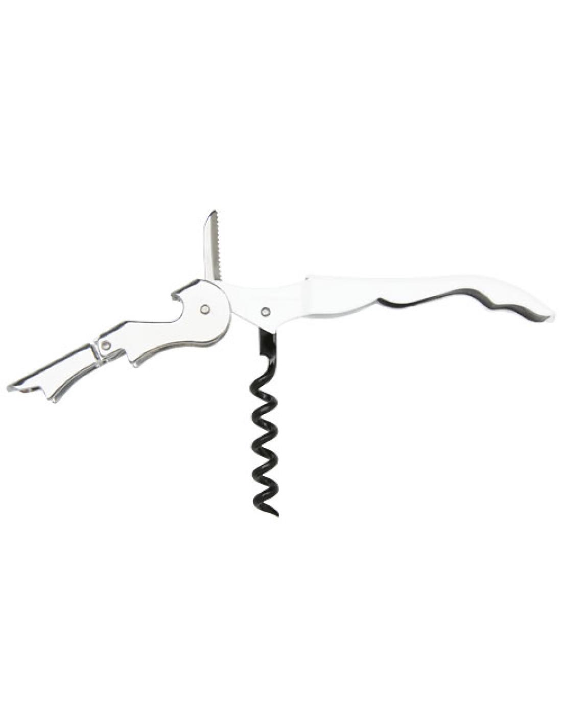 Un abridor de camarero de acero inoxidable con cuerpo colorido, sacacorchos, cortacápsulas y abrebotellas. Gracias a su estructura de dos tiempos es fácil sacar el corcho de la botella.