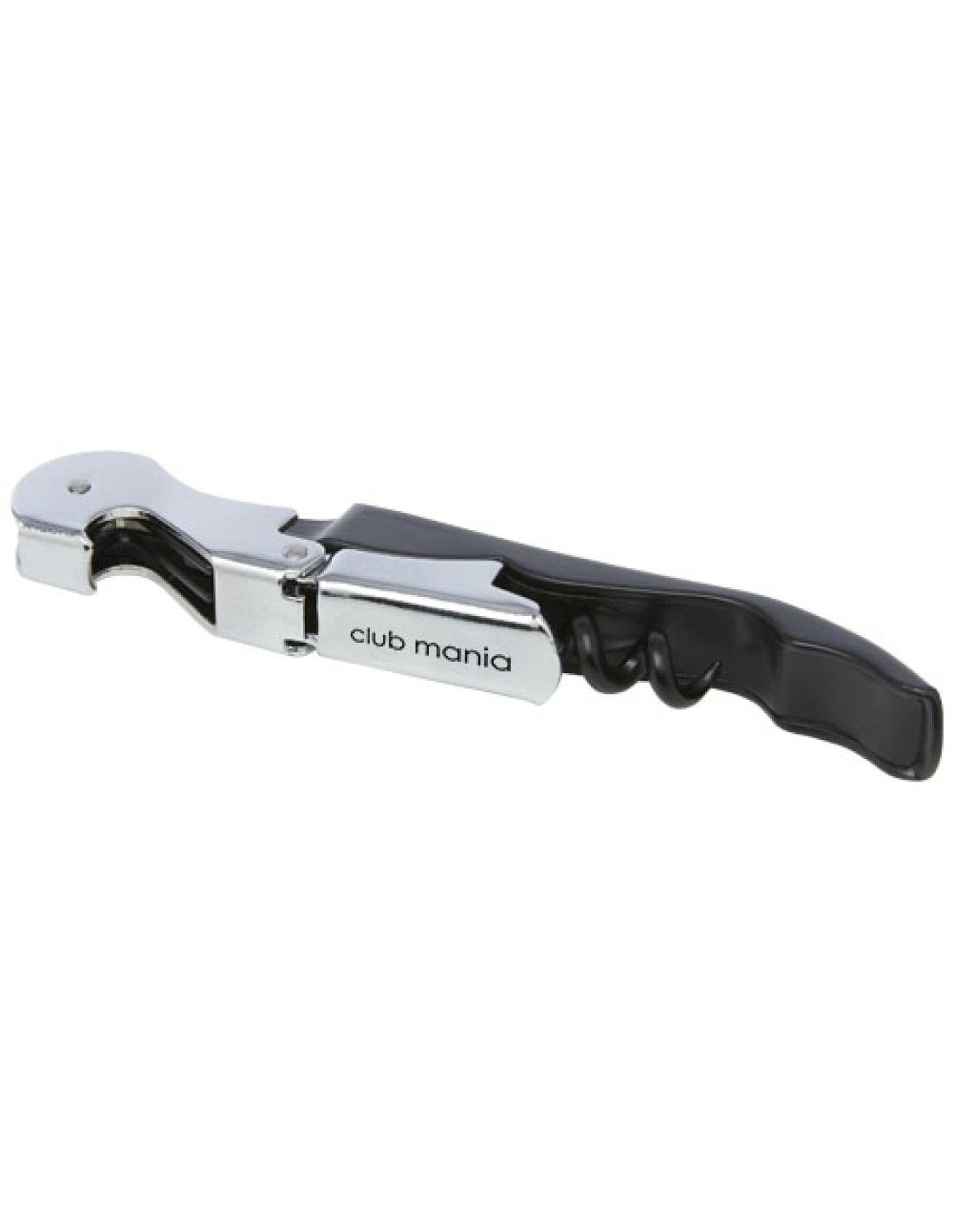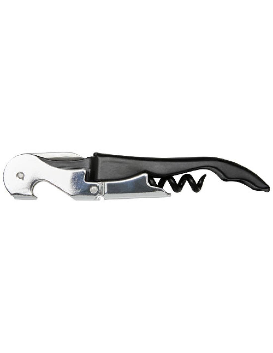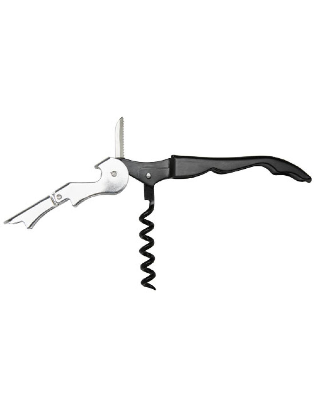 Un abridor de camarero de acero inoxidable con cuerpo colorido, sacacorchos, cortacápsulas y abrebotellas. Gracias a su estructura de dos tiempos es fácil sacar el corcho de la botella.