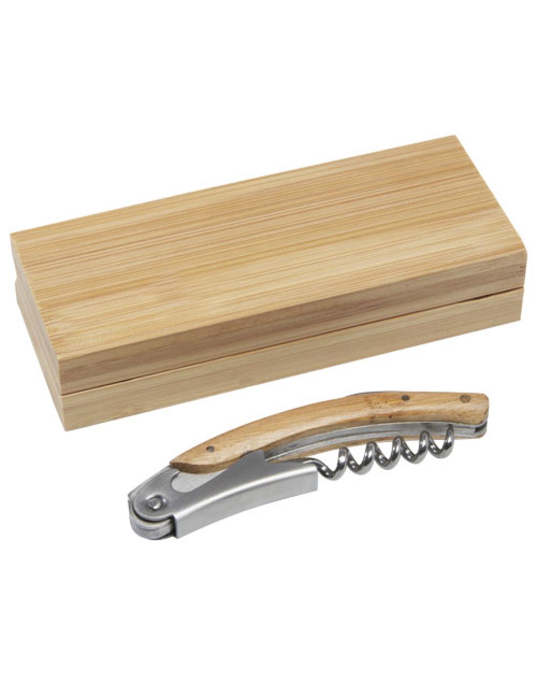 Un abridor de camarero de acero inoxidable con sacacorchos, cortacápsulas retráctil y mango de bambú natural. El bambú utilizado se obtiene y produce según normas de sostenibilidad.