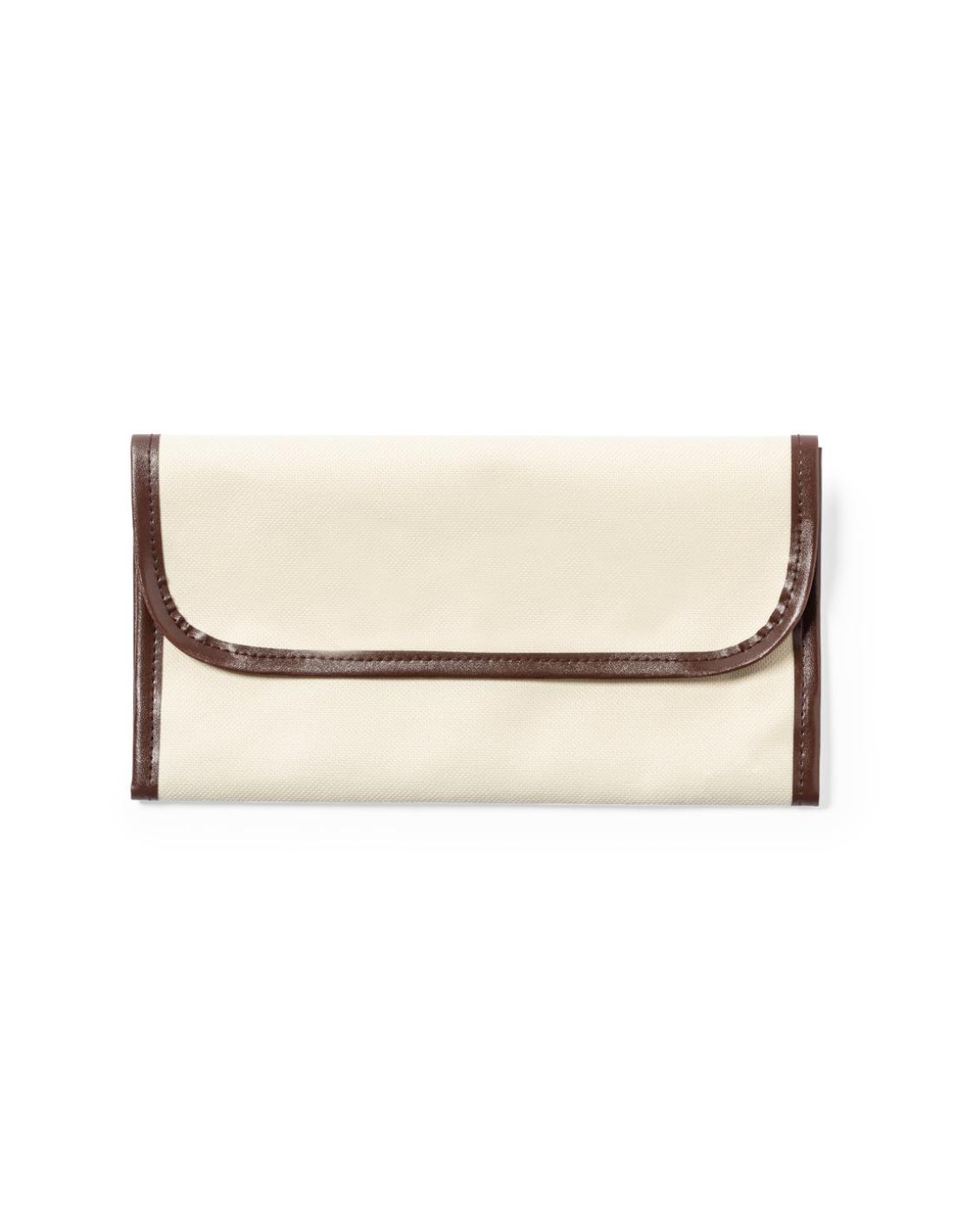 Portadocumentos de viaje fabricado en resistente 600D de acabado natural, con ribetes y refuerzos en polipiel marrón. Solapa con cierre de velcro y multitud de compartimentos interiores.