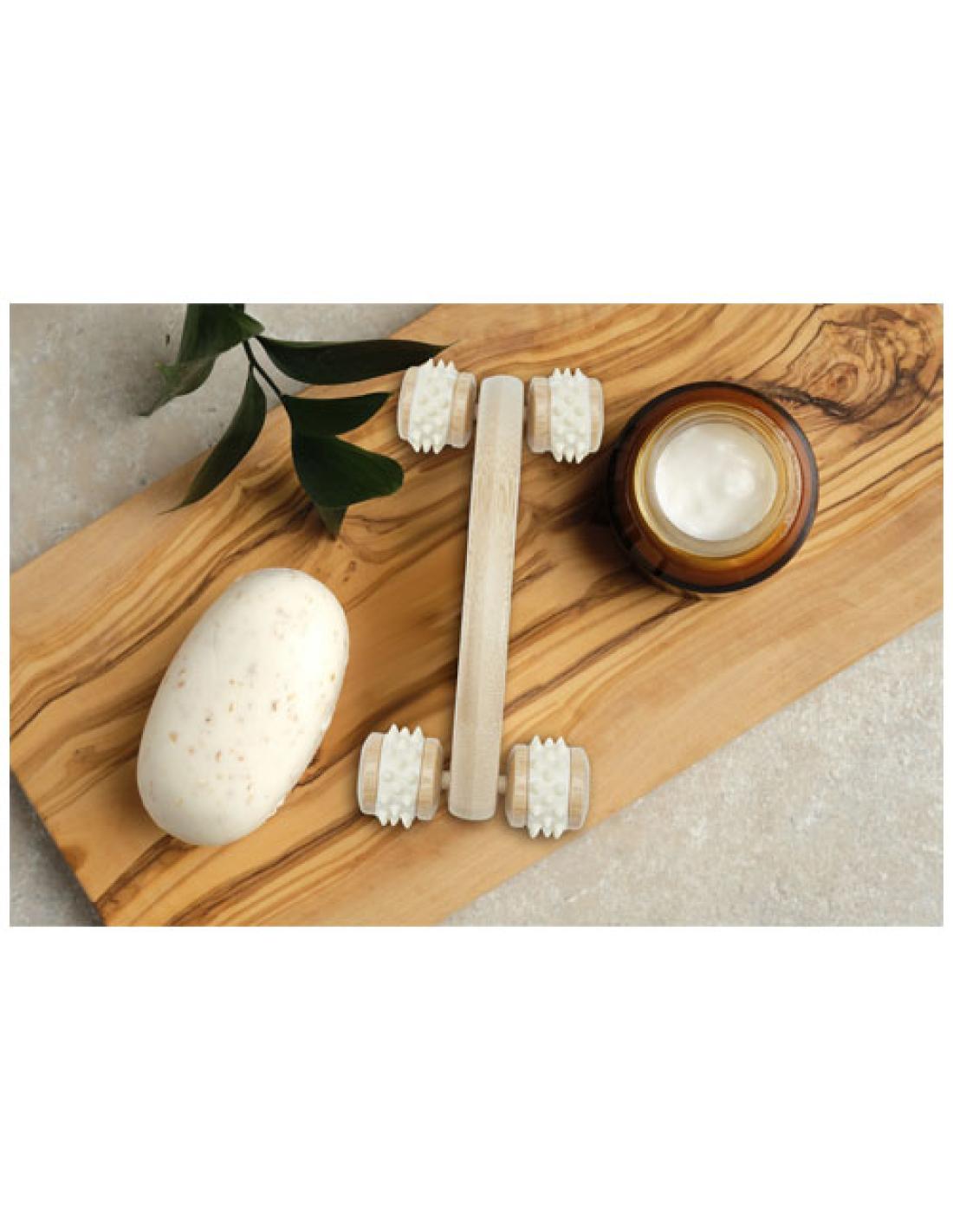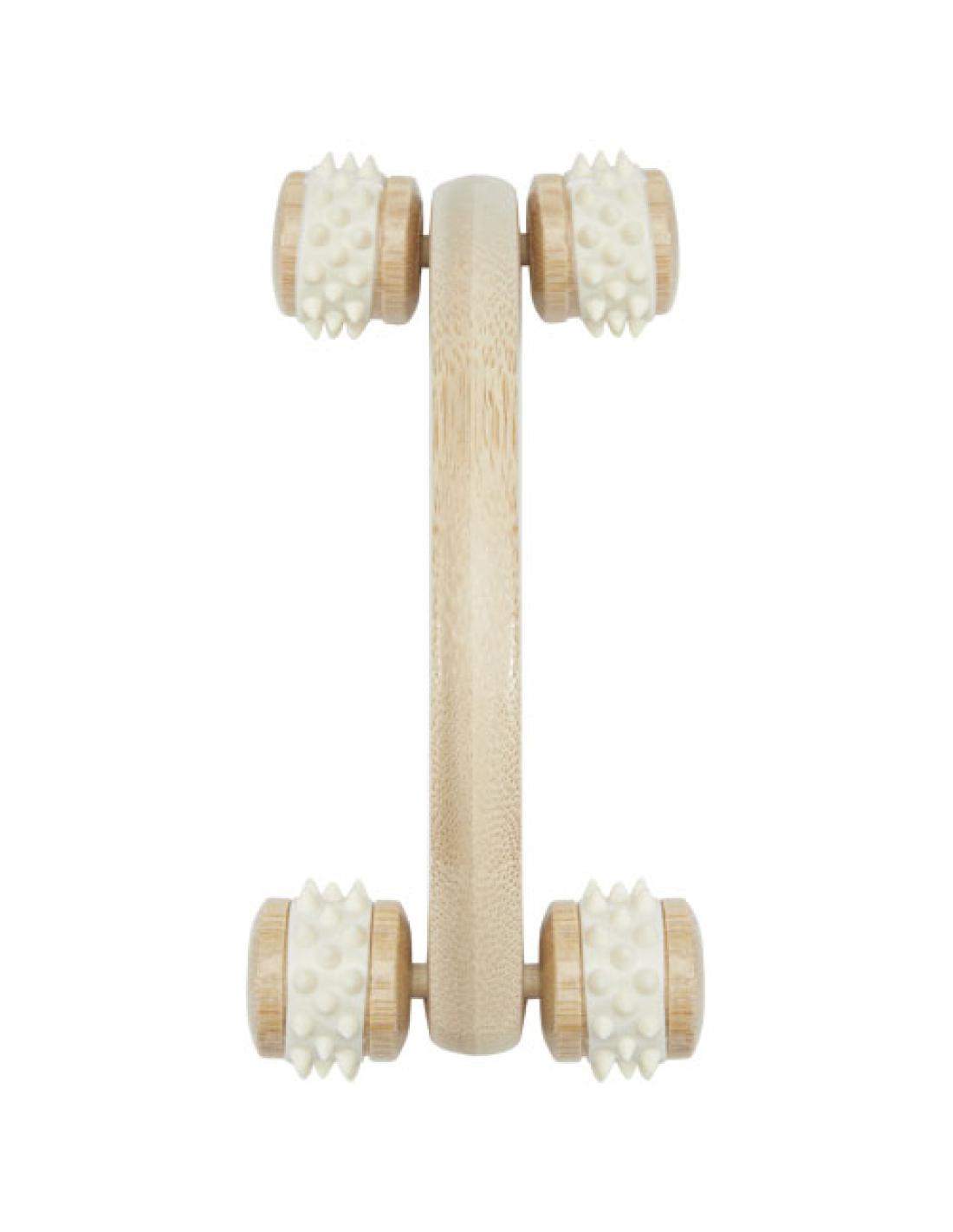 El masajeador de bambú "Volu" está especialmente diseñado para masajear brazos, piernas, glúteos, muslos, cintura y abdomen. Libera la tensión muscular, mejora la circulación sanguínea, reduce la neuralgia, elimina la fatiga y ayuda a mantener los músculos sanos. El bambú utilizado se obtiene y produce según normas de sostenibilidad.