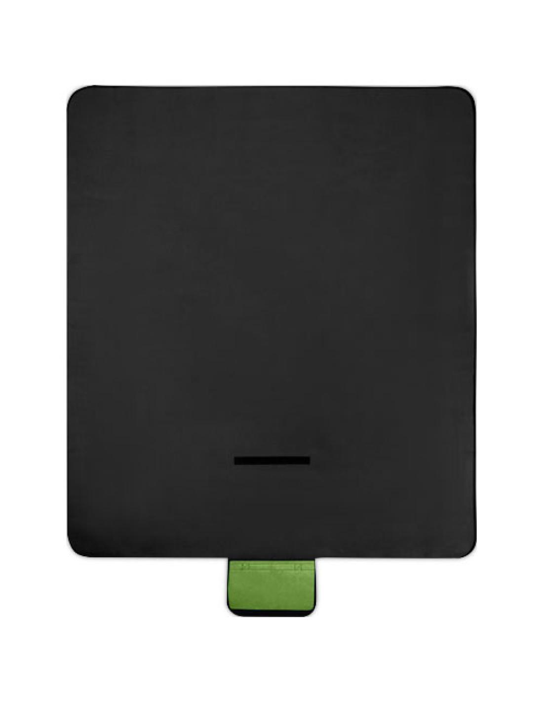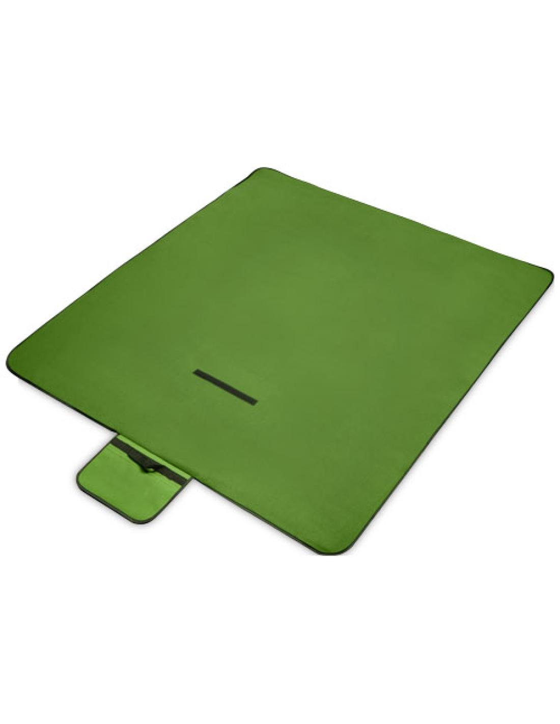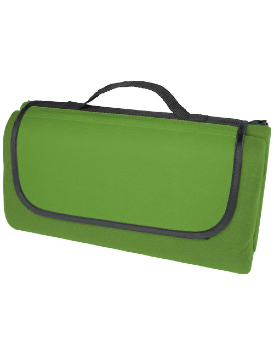 Manta para pícnic resistente al agua de 140 g/m² fabricada con plástico PET reciclado. Una vez plegada y fijada, la manta es fácil de guardar y transportar con el asa de transporte incluida.