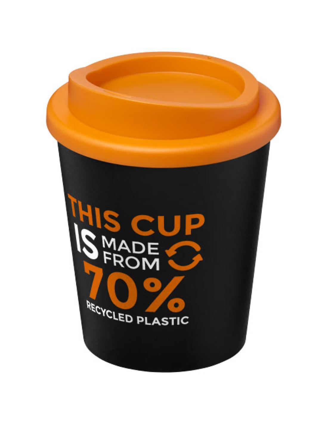 Vaso con aislamiento de doble pared y tapa de rosca compacto. Se adapta a la mayoría de las cafeteras. El vaso está hecho de plástico de polipropileno 75 % reciclado, mientras que la tapa está hecha de plástico de polipropileno de grado alimenticio. Dado que la tapa no está hecha de material reciclado, está disponible en una amplia gama de colores. La taza es totalmente reciclable. Los tonos de negro pueden variar de color de textura por la naturaleza del material reciclado. Capacidad de 250 ml. Fabricado en el Reino Unido. Embalado en una bolsa compostable para el hogar.