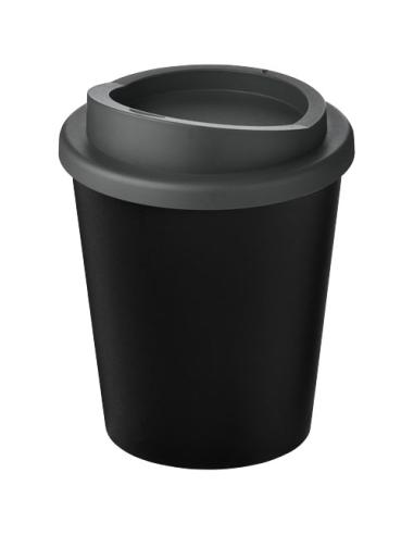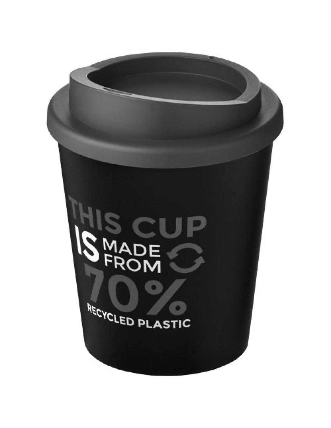 Vaso con aislamiento de doble pared y tapa de rosca compacto. Se adapta a la mayoría de las cafeteras. El vaso está hecho de plástico de polipropileno 75 % reciclado, mientras que la tapa está hecha de plástico de polipropileno de grado alimenticio. Dado que la tapa no está hecha de material reciclado, está disponible en una amplia gama de colores. La taza es totalmente reciclable. Los tonos de negro pueden variar de color de textura por la naturaleza del material reciclado. Capacidad de 250 ml. Fabricado en el Reino Unido. Embalado en una bolsa compostable para el hogar.