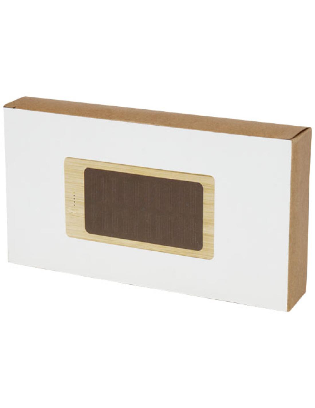 Batería externa de bambú de 8000 mAh con doble salida USB. Panel solar integrado para una carga rápida, ideal para actividades al aire libre. Entrada tipo C de 5 V/2 A, salida 1 USB de 5 V/1 A y salida 2 USB de 5 V/2 A. No se proporciona ningún cable accesorio por motivos de sostenibilidad. Se entrega en una caja de regalo que incluye un manual de instrucciones (ambos fabricados con materiales sostenibles).