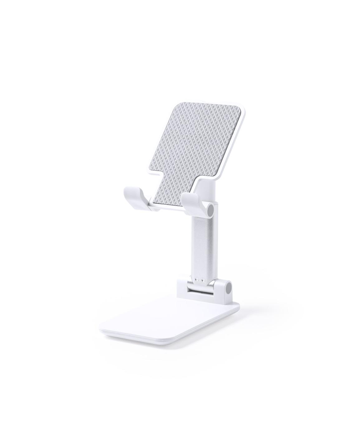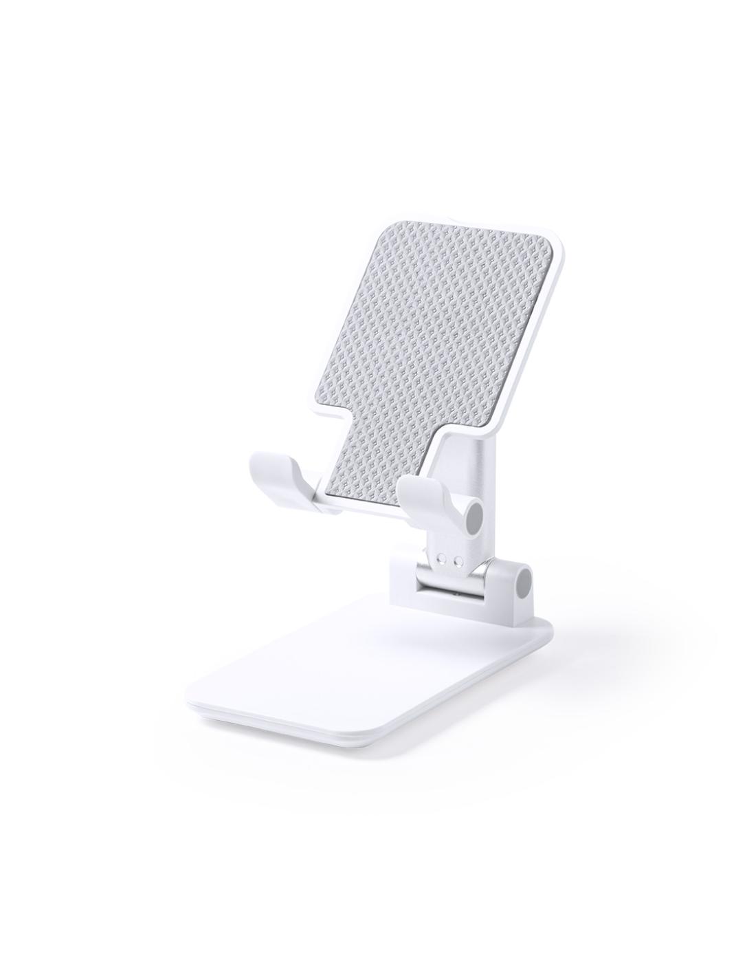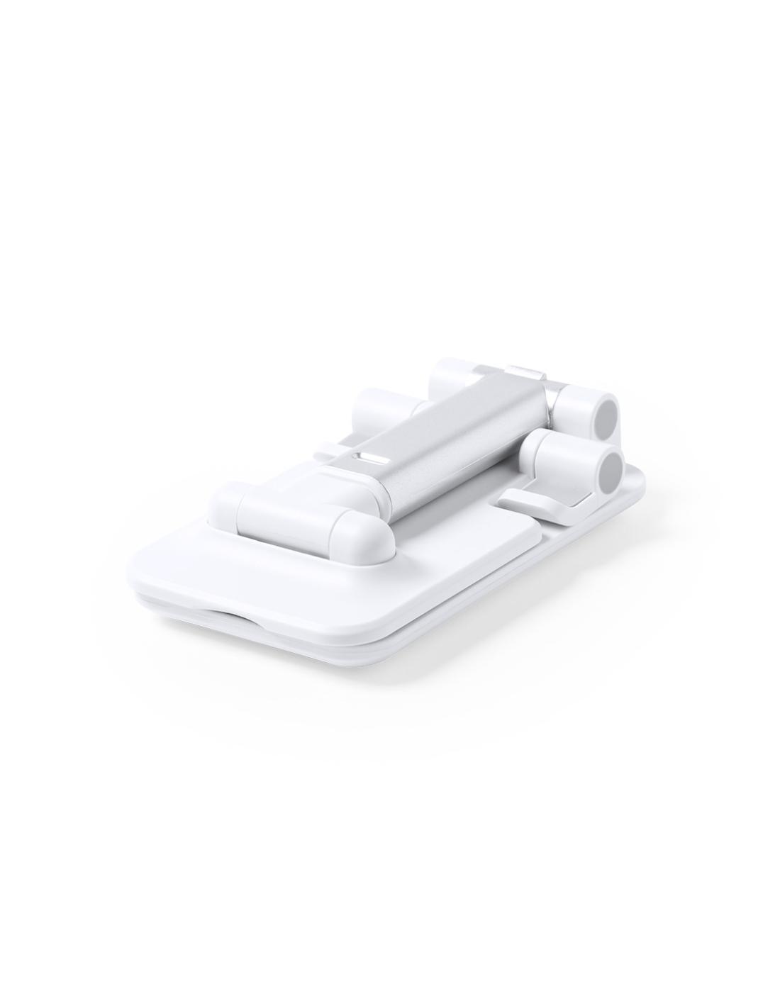 Soporte plegable para smartphones y tablets. Regulable en altura, incluye protecciones de goma antideslizantes en base y soporte. En sobrio acabado de color blanco y con amplia superficie de marcaje, especialmente indicado para impresión en tampografía. Presentado en atractiva caja de diseño.