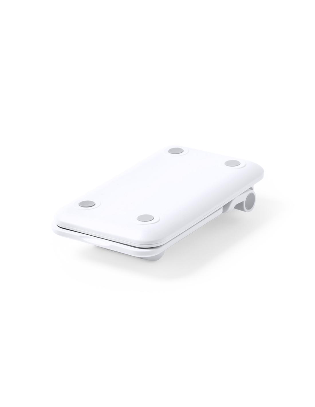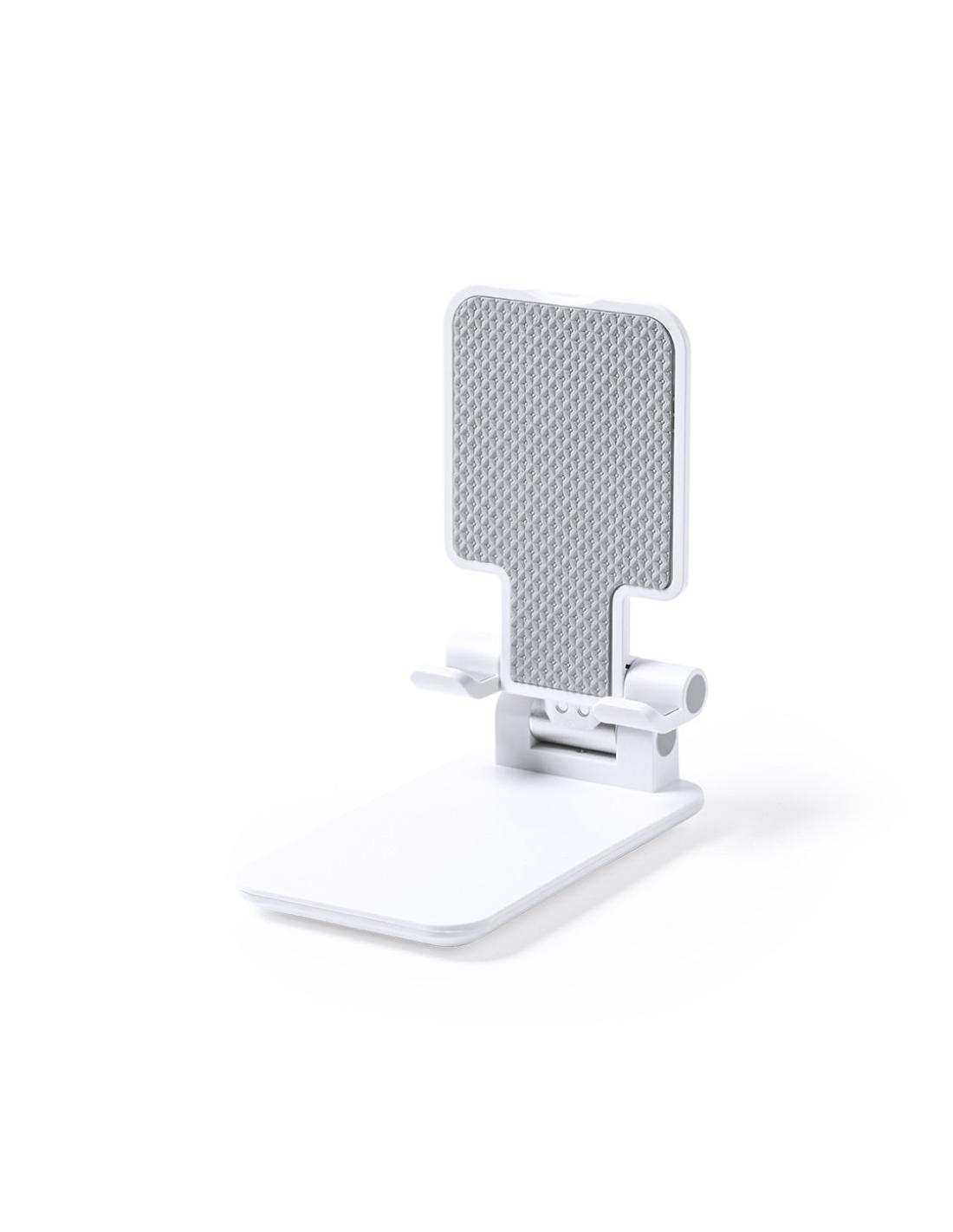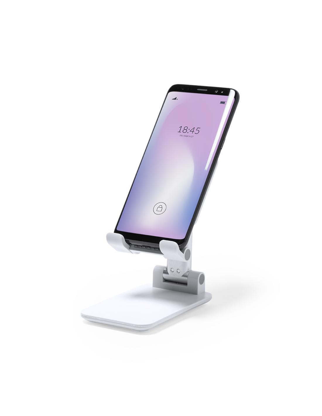 Soporte plegable para smartphones y tablets. Regulable en altura, incluye protecciones de goma antideslizantes en base y soporte. En sobrio acabado de color blanco y con amplia superficie de marcaje, especialmente indicado para impresión en tampografía. Presentado en atractiva caja de diseño.