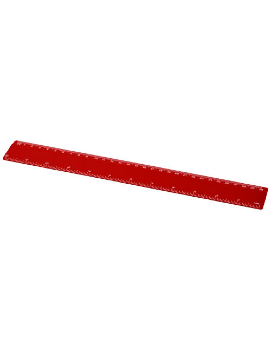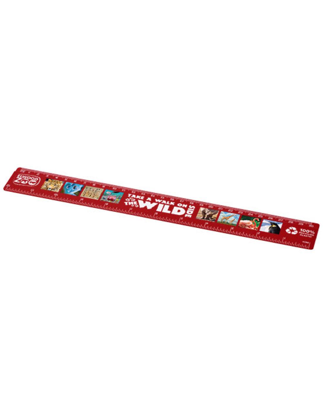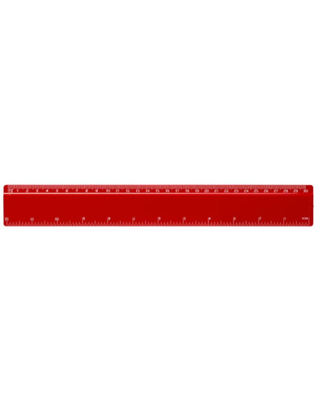 Regla de plástico reciclado sólida con marcas tanto en pulgadas como en centímetros.